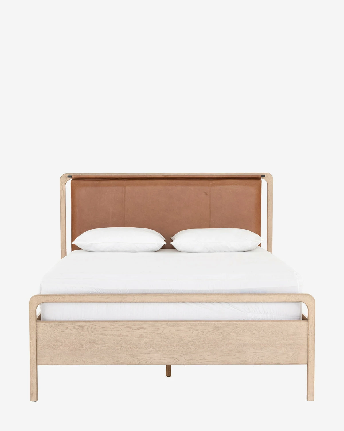 Crafted from a stunning material mix of oak, leather and metal, the Hensley Bed brings modern design to the forefront of your bedroom. Its washed oak frame features smooth curves and tapered legs, while a sling-style headboard constructed from top grain leather elevates its simple silhouette.