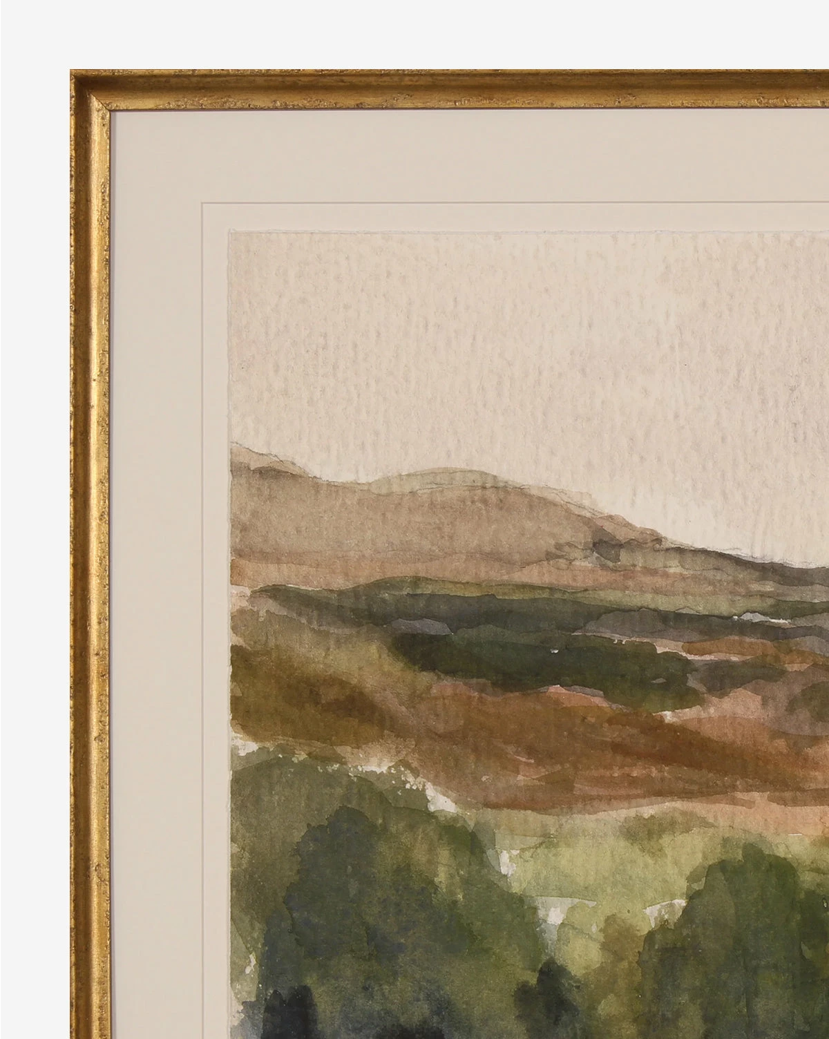 Bold, earthy tones create depth in Hillside Trail. Its soft landscape scene is contemplative and inviting. A giclee print with high-quality picture framing glass, the piece is framed in gold-finished wood, displaying its museum-quality treatment among your decor.Â