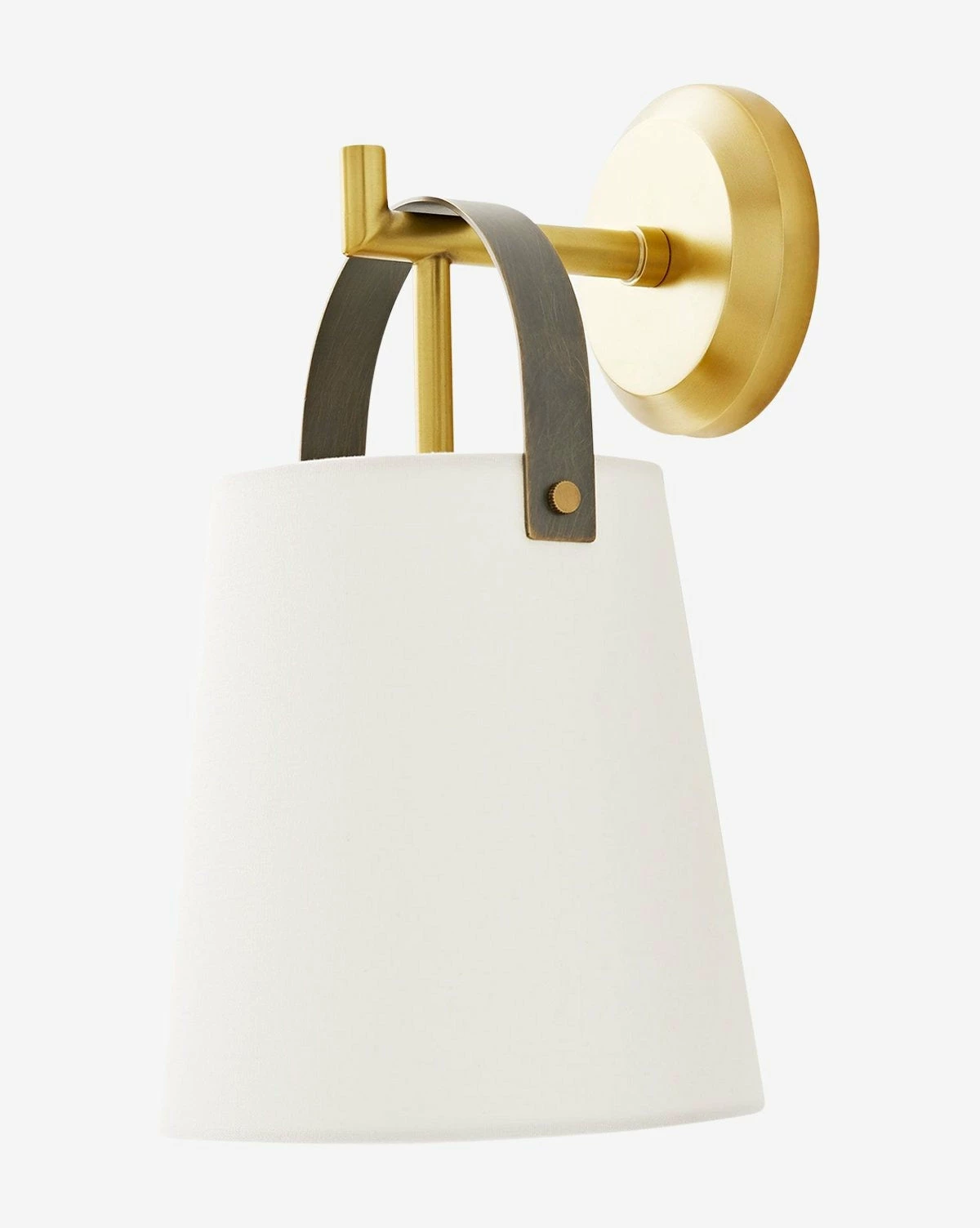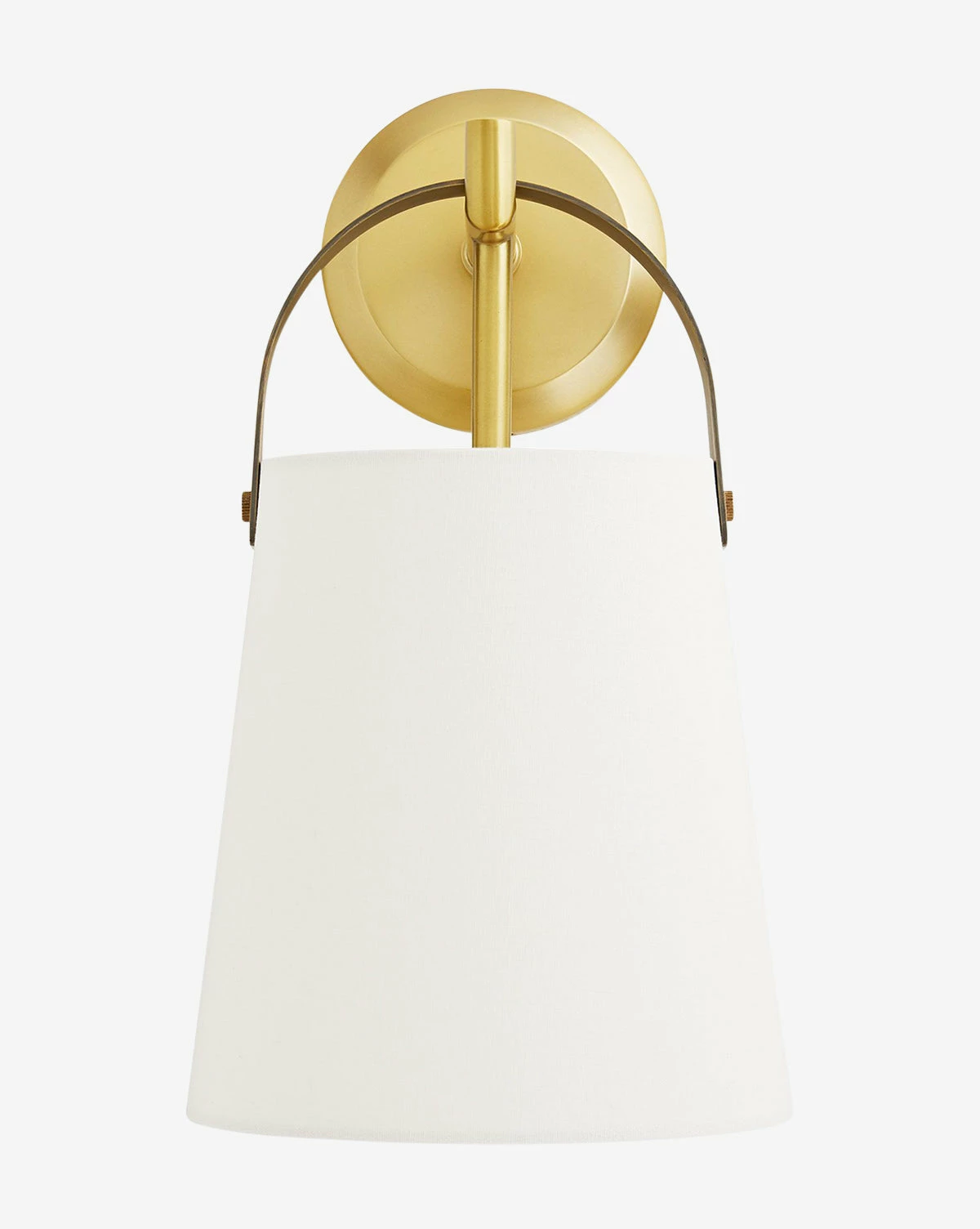 Showcasing a modern take on cavalier elegance, the Ian Sconce adds soft flare to the classic white linen shade. Suspended by a stirrup-inspired English bronze steel strap, its shade delicately tapers into a timeless form. Its bold, antique brass backplate adds a beautiful metallic touch to the fixture, which can be styled as a standalone piece or hung in sets for a stronger statement.