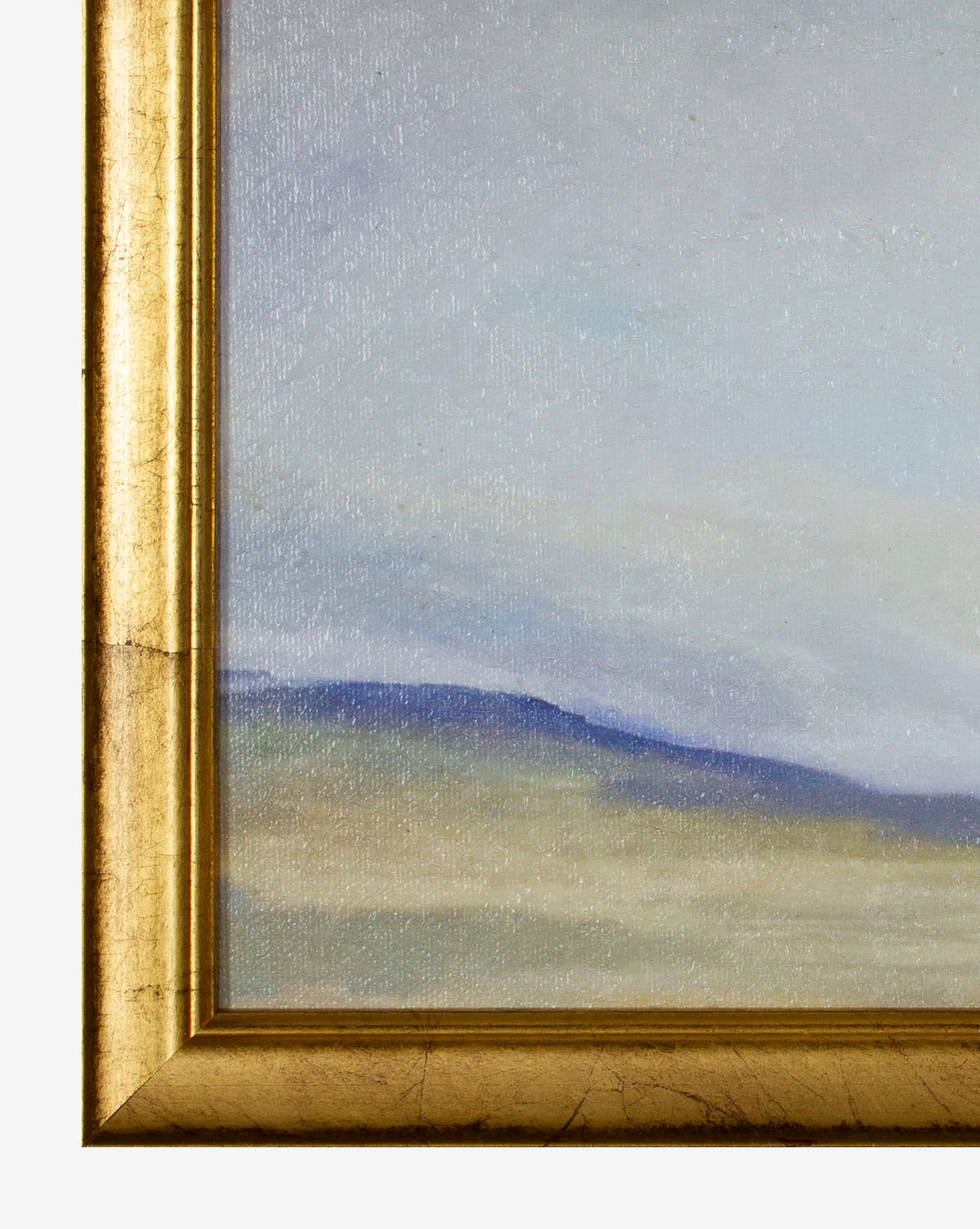 A serene pastel landscape, Indigo Skyline is a beautiful mix of blue and natural tones. A gold wood frame gives the piece a bold presence in your space, elevating wall treatments or dresser vignettes. Â