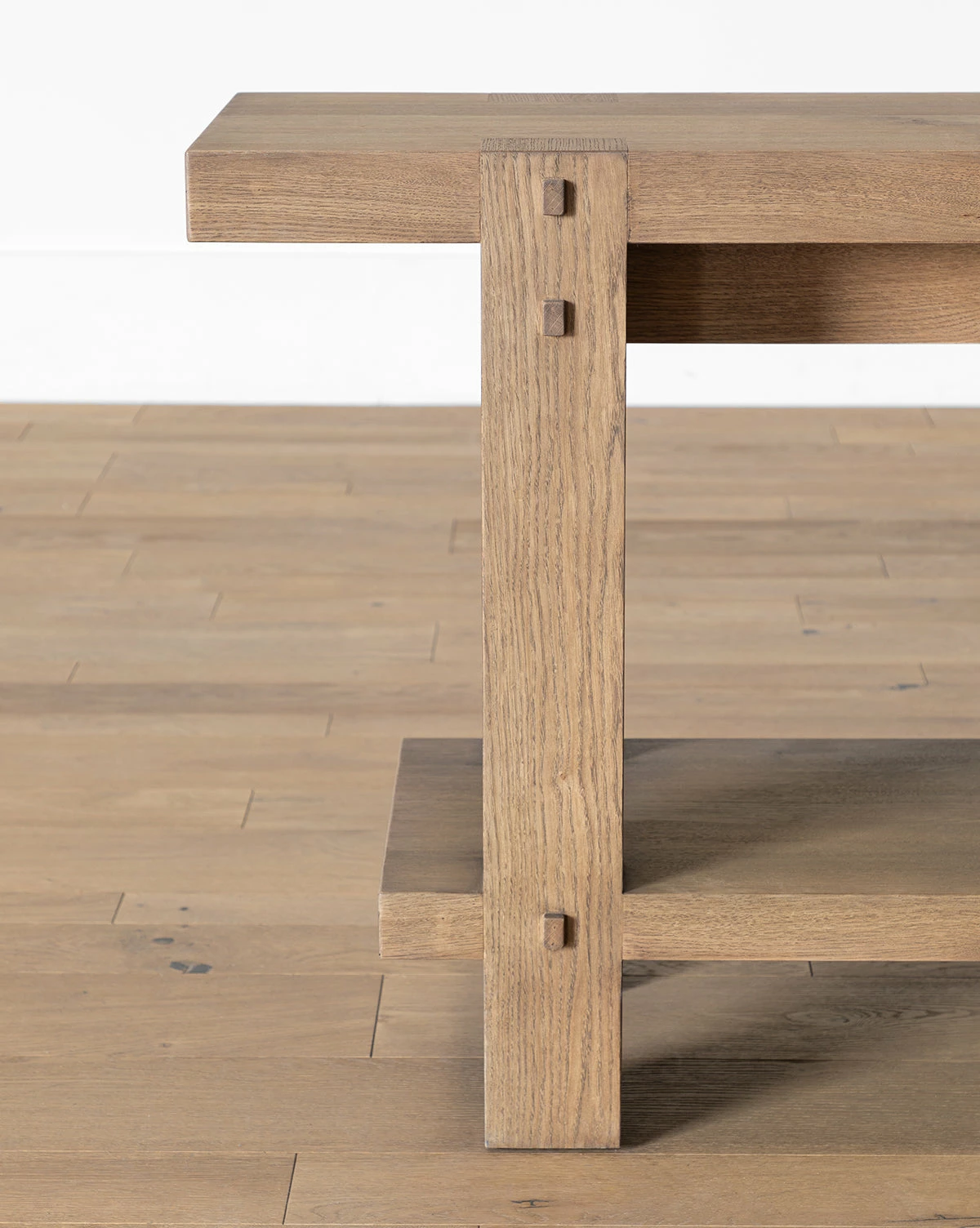 With rustic playfulness, our Jack Console Table has a neutral, warm white oak finish and an inviting farmhouse console table feel. Featuring exposed joinery, this modern update on a traditional farmhouse console brings cohesion to your space with subtle sophistication.
