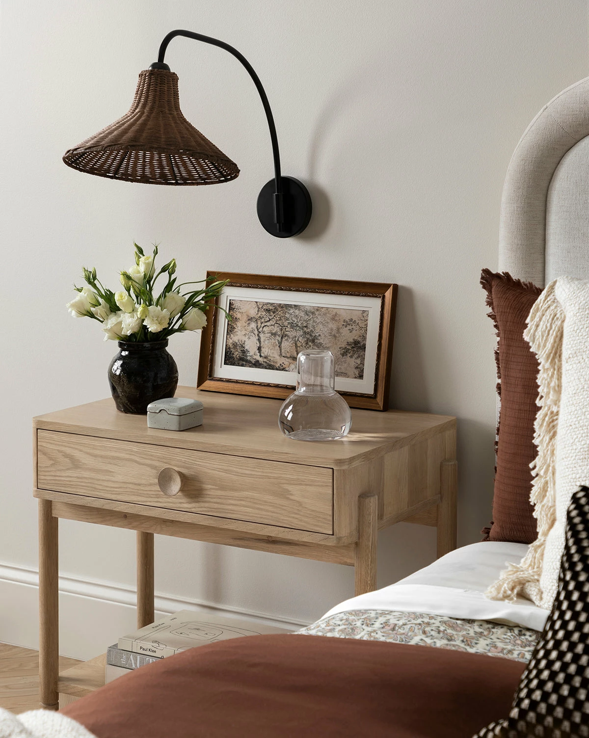 Featuring a streamlined yet organic bell-shaped shade woven from natural rattan, the Johanson Woven Sconce is plated in a contrasting antique bronze finish and swivels 140-degrees. Seamlessly blending modern shapes with textural materials, this sconce brings an organic, airy tone everywhere from hallways to bedrooms.