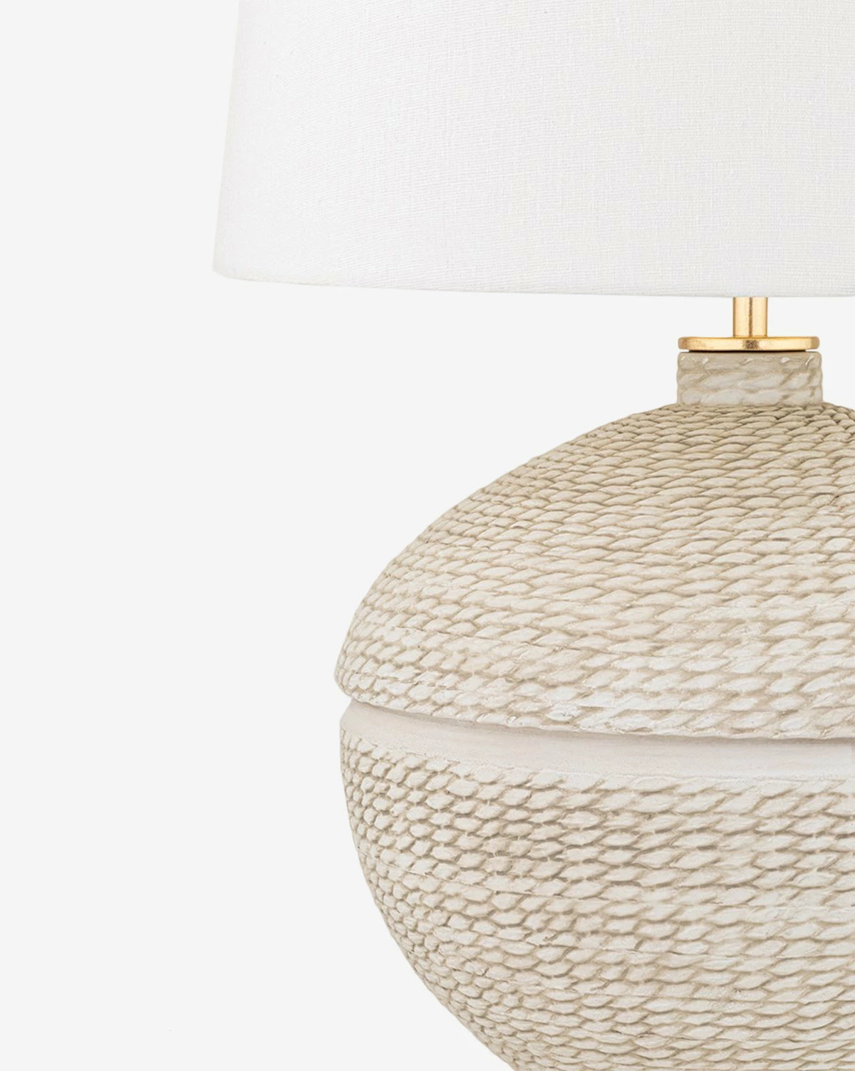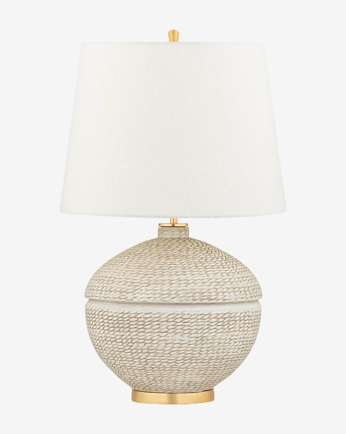 Stained and textured in a hand-woven style, the Katonah Table Lamp is endearingly approachable. Its beige and cream palette is airy and light, complemented by gold leaf accents on the base, collar, and finial of the lamp. Complete with a Belgian linen shade, the Katonah Table Lamp is both earthy and elegant with a touch of organic texture.