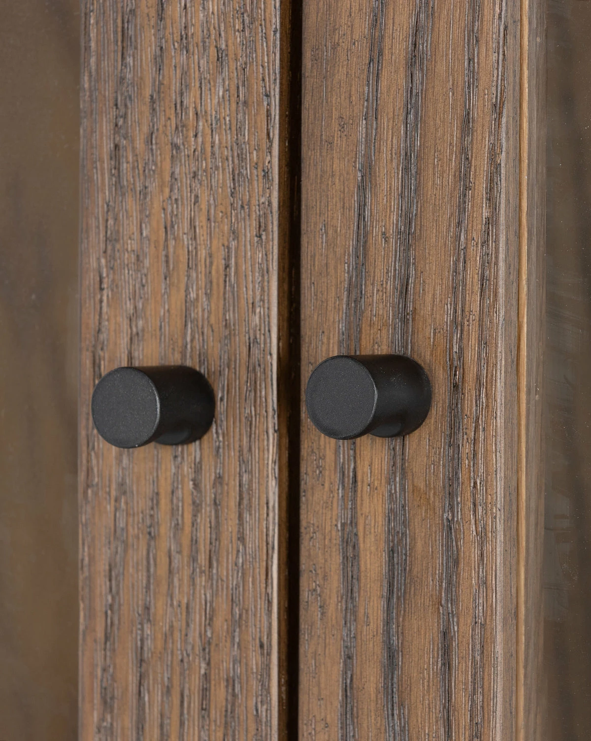 Dynamically designed, the Kiah Cabinet has a warm finish and a stately form. All tucked inside beautifully framed glass doors, the shelving of the oak veneer cabinet is perfect for styling your more precious pieces.