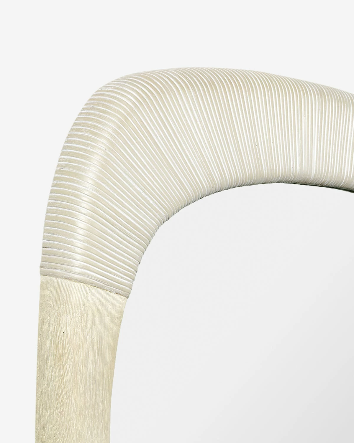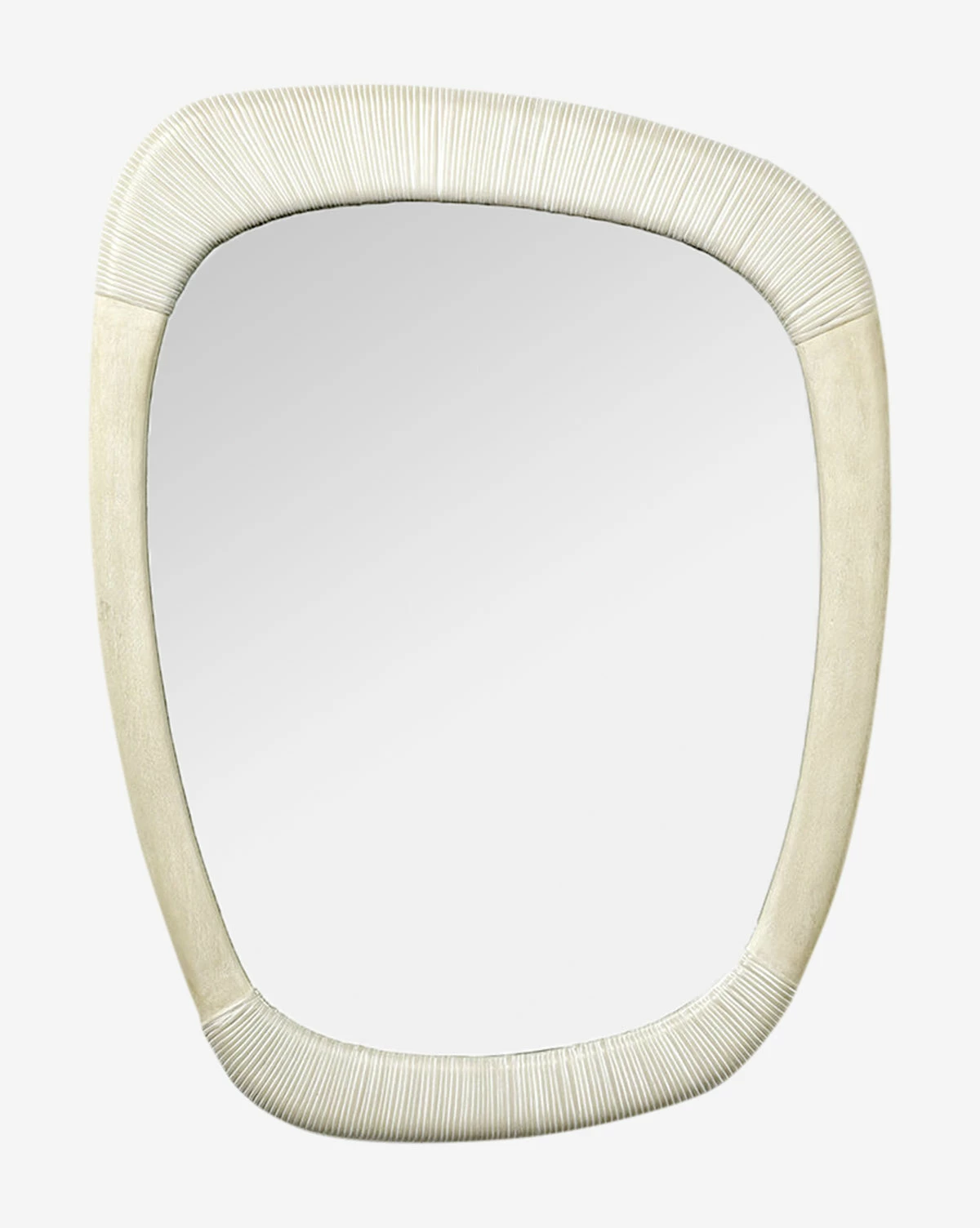 With a wood frame accented by wrapped rattan details, the Kipton Wall Mirror draws attention with its abstract shape. The thick frame in a khaki finish provides a subtly grounding feature among your decor whether styled in an entryway or bedroom.