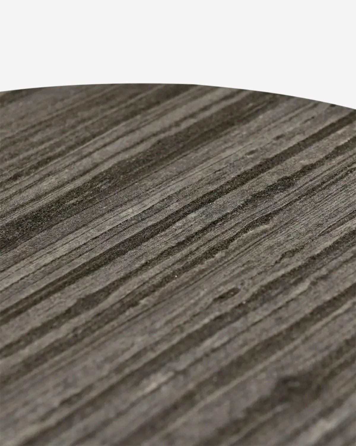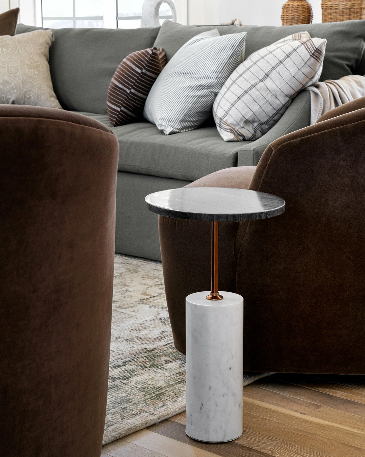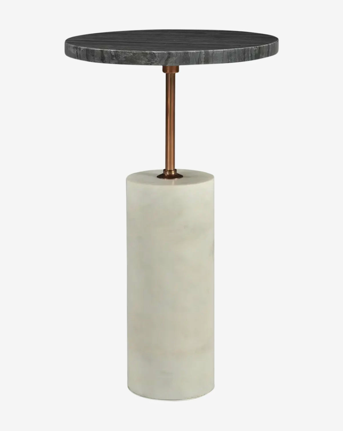 The Larsen Accent Table creates a compelling contrast with its mixed material construction. A beautifully designed marble base supports a brass-finished extension below the smooth and detailed marble tabletop.