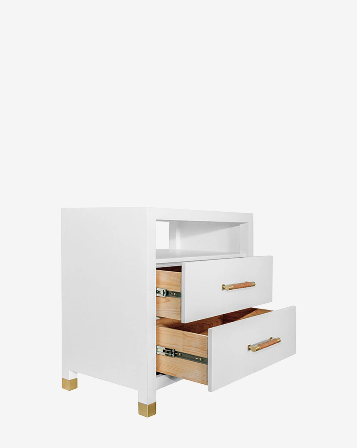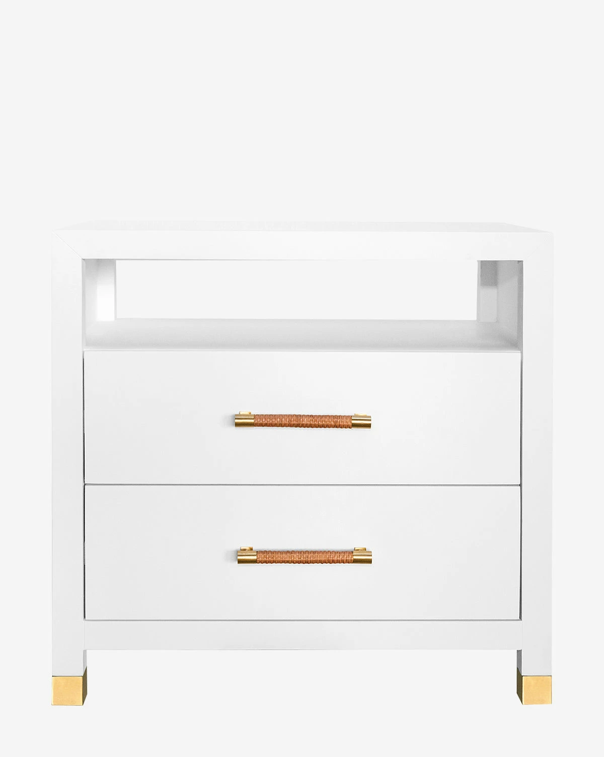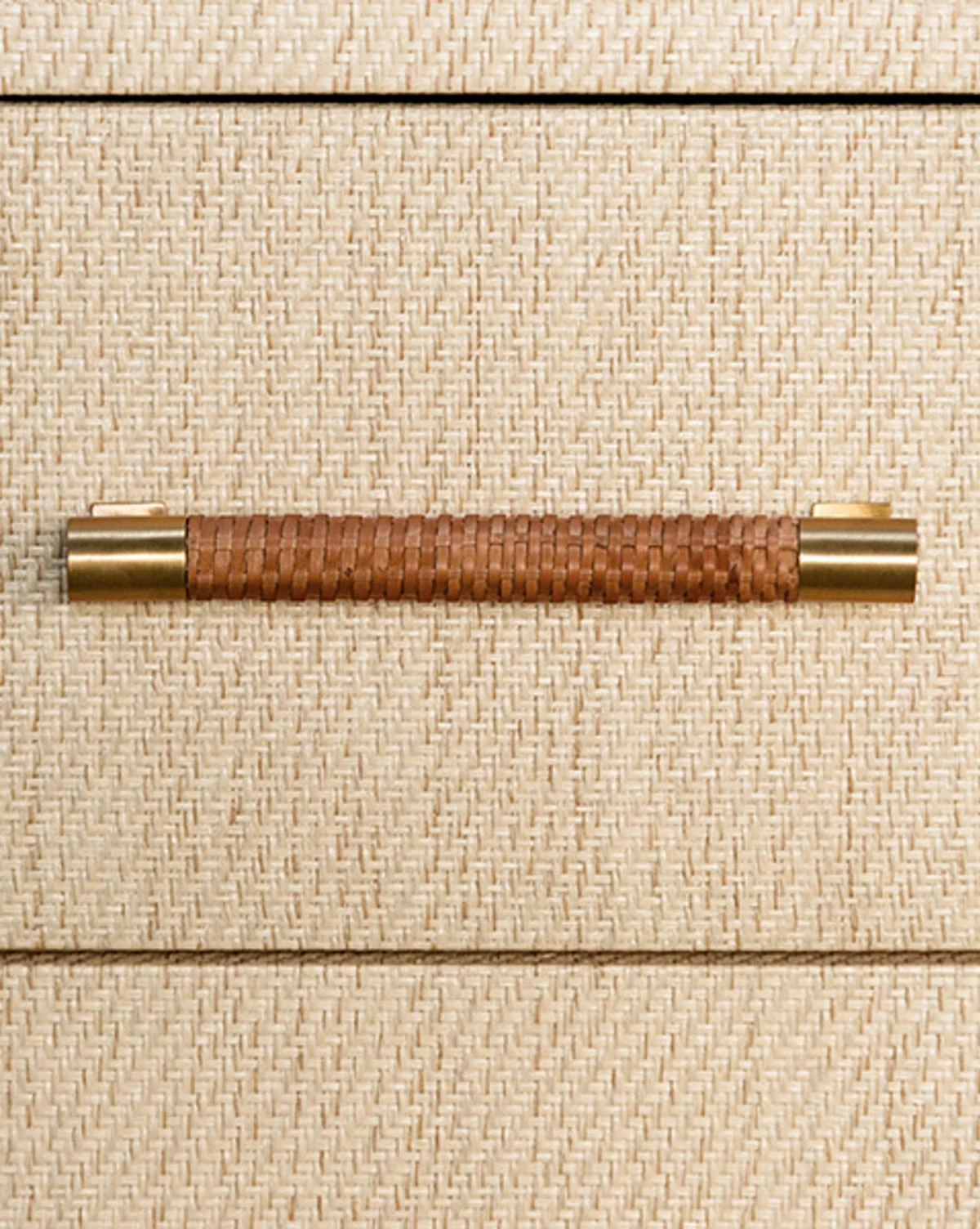 Simple yet elevated, the Leonardo Nightstand features stunning details. The two drawers are complete with rattan wrapped handles, complementing its metallic details and straightforward design. Finished in either natural grasscloth or matte white, the wood frame holds spacious drawers for functional storage.
