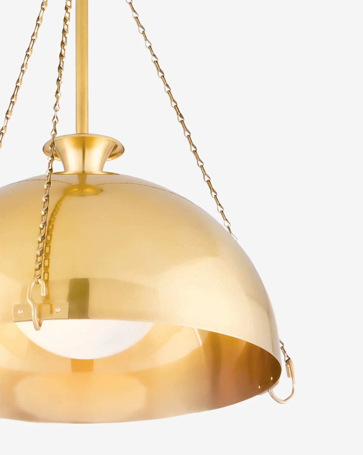 Thoughtfully designed, the Levette Pendant features an eye-catching dome shade in two bold finishes. The shade is held by a handmade chain, connected to a sleek stem. Refined details elevate this pendant and bring subtle sophistication to your decor.
