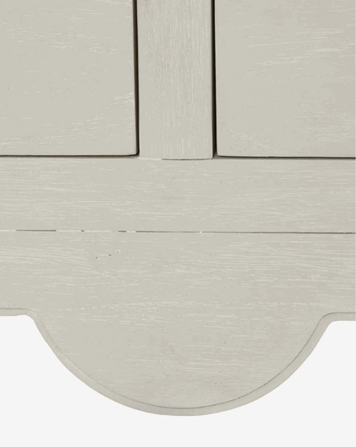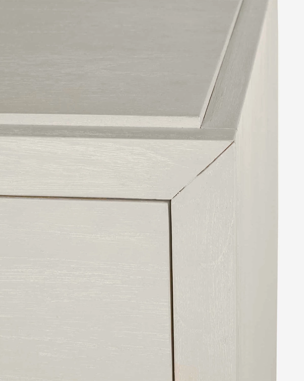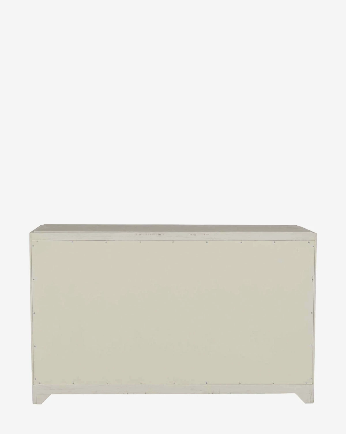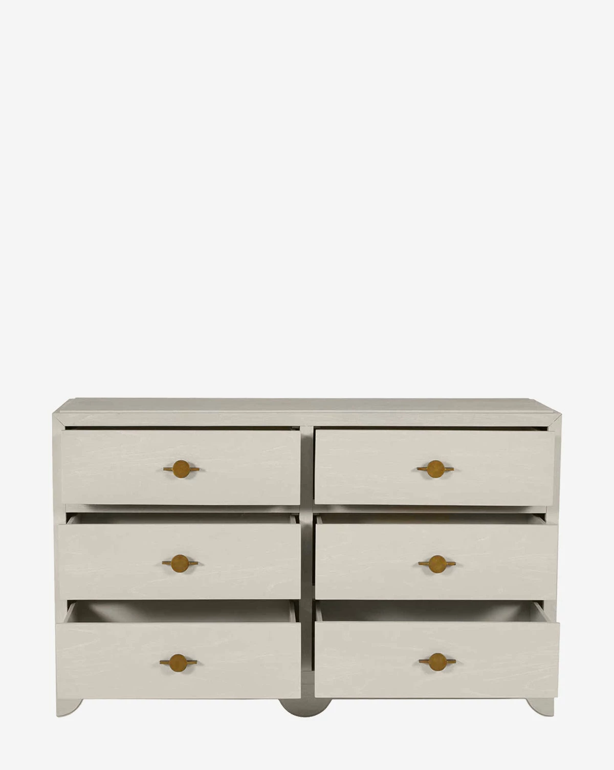 The Lilah Dresser features a classic look and feel with its straightforward structure and subtle details. Made from mindi wood, the dresser has a cerused white finish that only highlights the beautiful iron circular hardware. The slightly raised top and semicircular feet add dimension and playfulness to this piece.
