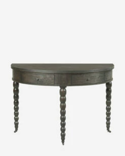 With a moody worn black finish, the Livia Table is a vintage-inspired demi-lune table. Made with oak, the table is full of detail that will elevate your entryway. Its storage drawers are mounted with turned brass knobs and the charming bobbin legs rest on antique brass casters that speak to its thoughtful craftsmanship.