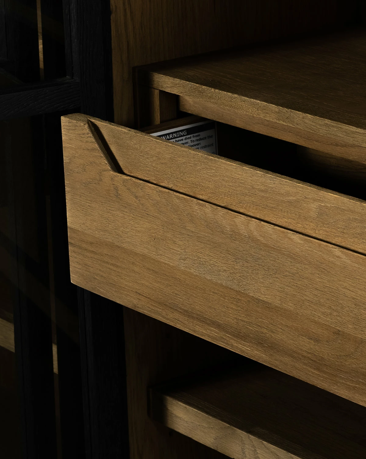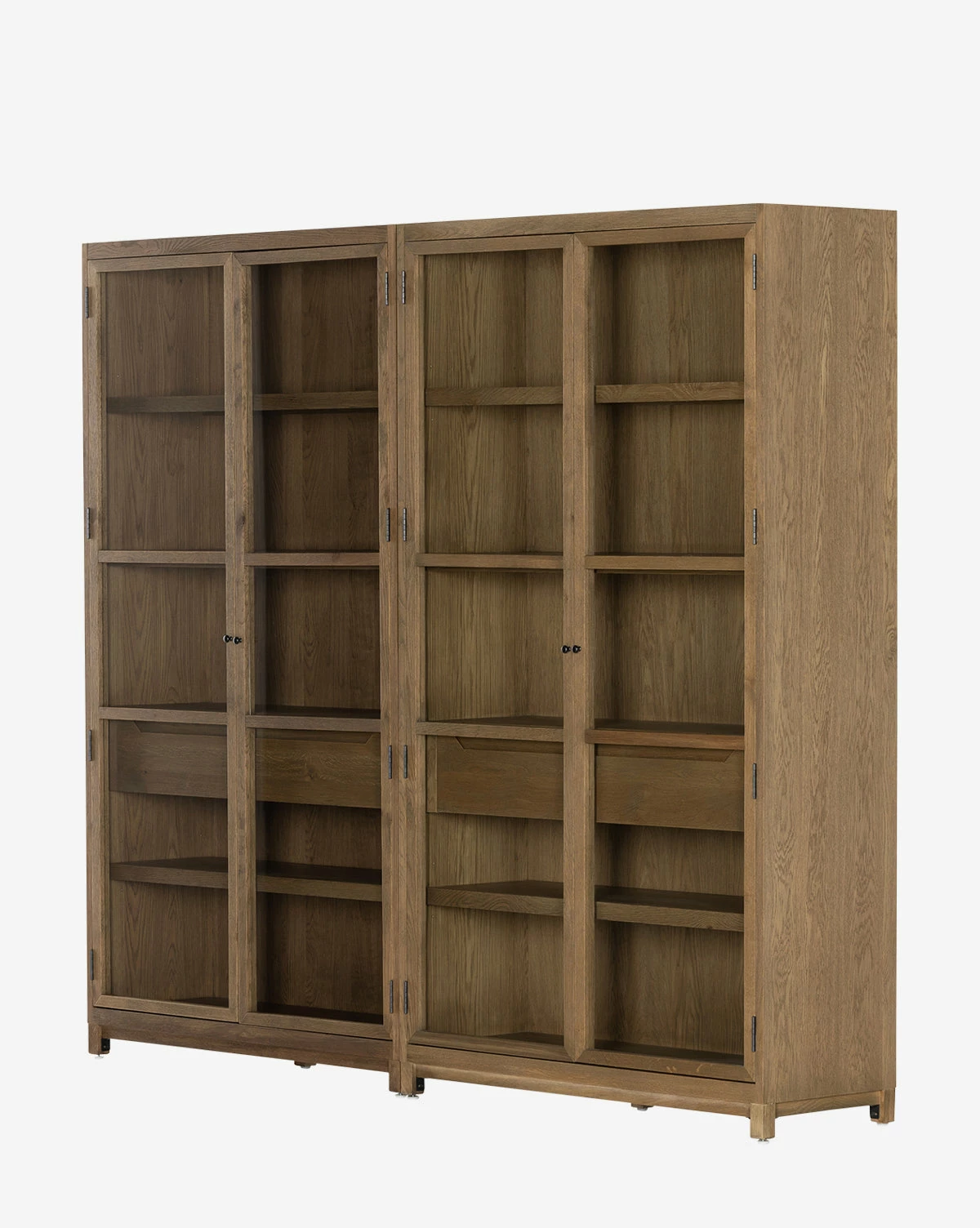 Two-toned with visual depth, the Maddox Bookcase has an oak frame with light interior shelving that creates rich contrast. Its glass doors put your favorite styling pieces and storage items on display, with four interior drawers that give concealed storage to the piece.
