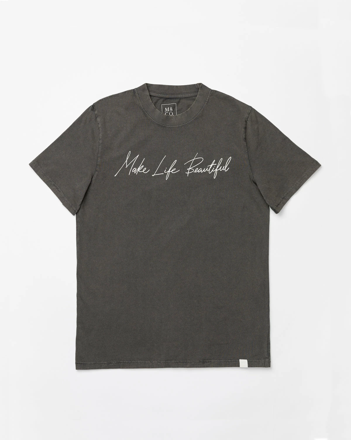 Rep McGee & Co. with our exclusive Make Life Beautiful T Shirt. Made from 100% cotton for a luxe, soft feel, this t shirt features the “Make Life Beautiful” slogan for a beautiful reminder of intentionality as you are restyling your home or running everyday errands. In a washed black color, this t shirt is neutral and easy to blend with your personal style.