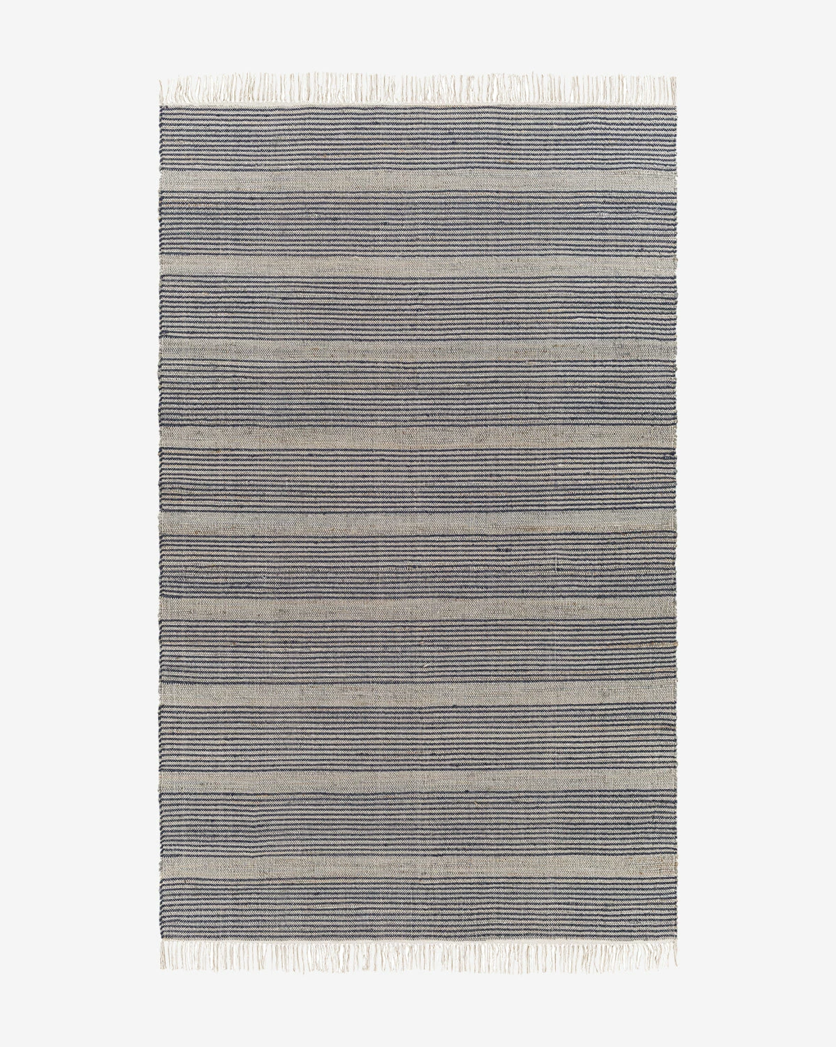 With an organic feel, the Mayon Navy Handwoven Rug brings both texture and dimension to your space. Made from a blend of jute and cotton, the striped motif of this rug is simple yet sophisticated, featuring navy, slate, and off-white tones.  Â
