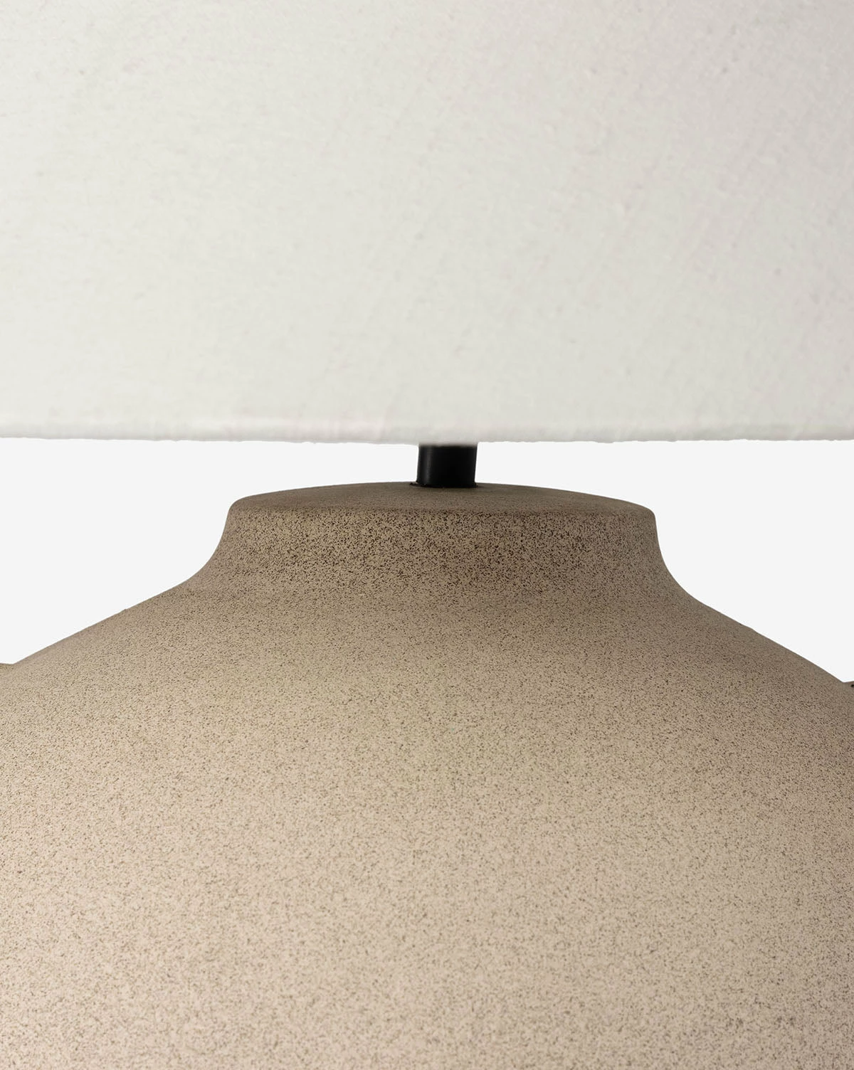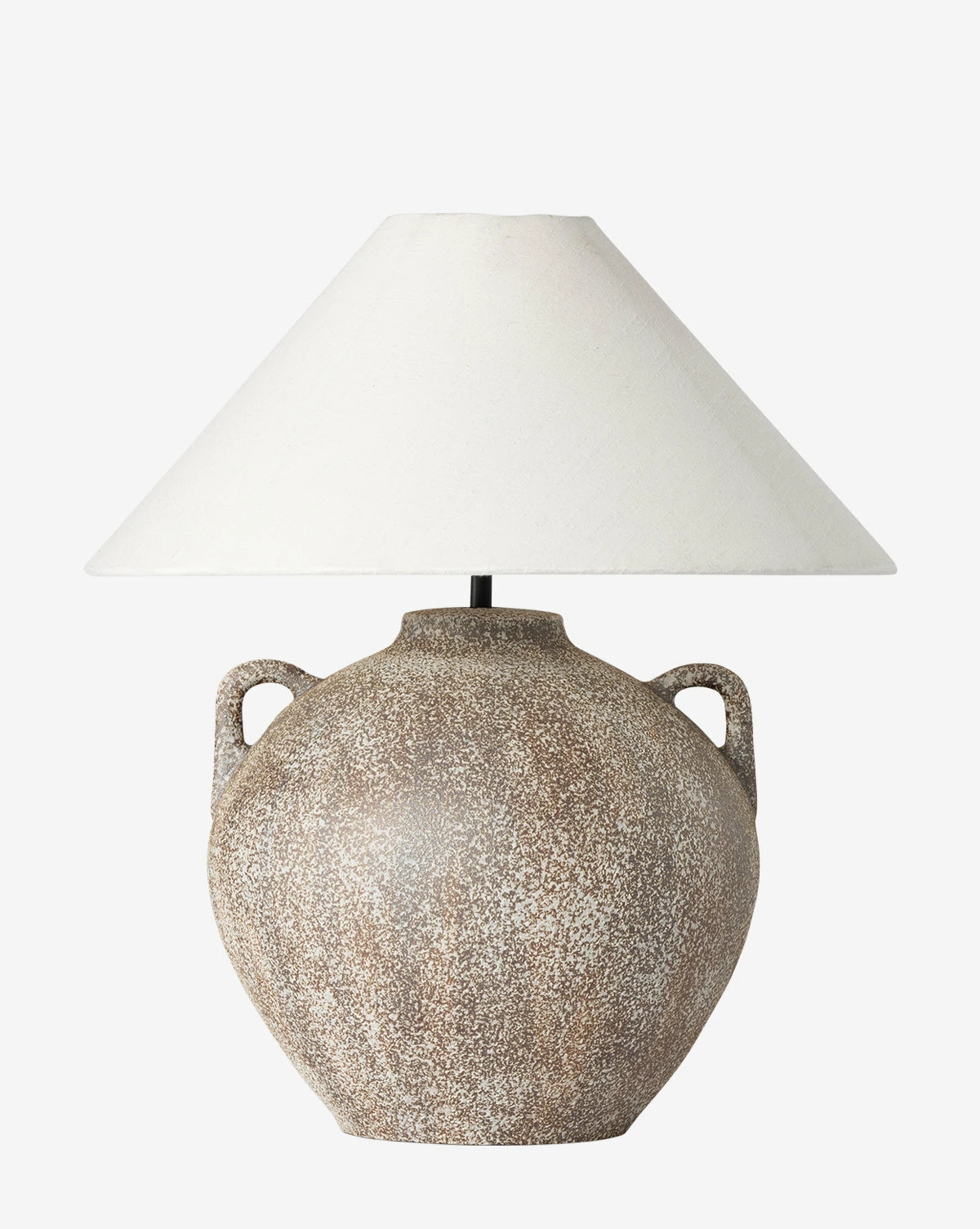 With a wide textural base, the Mays Table Lamp takes inspiration from vintage clay jars. Made from sand-colored talavera, the jar base features subtle texture and handle-like detailing that adds dimension to the tapered ivory linen shade.