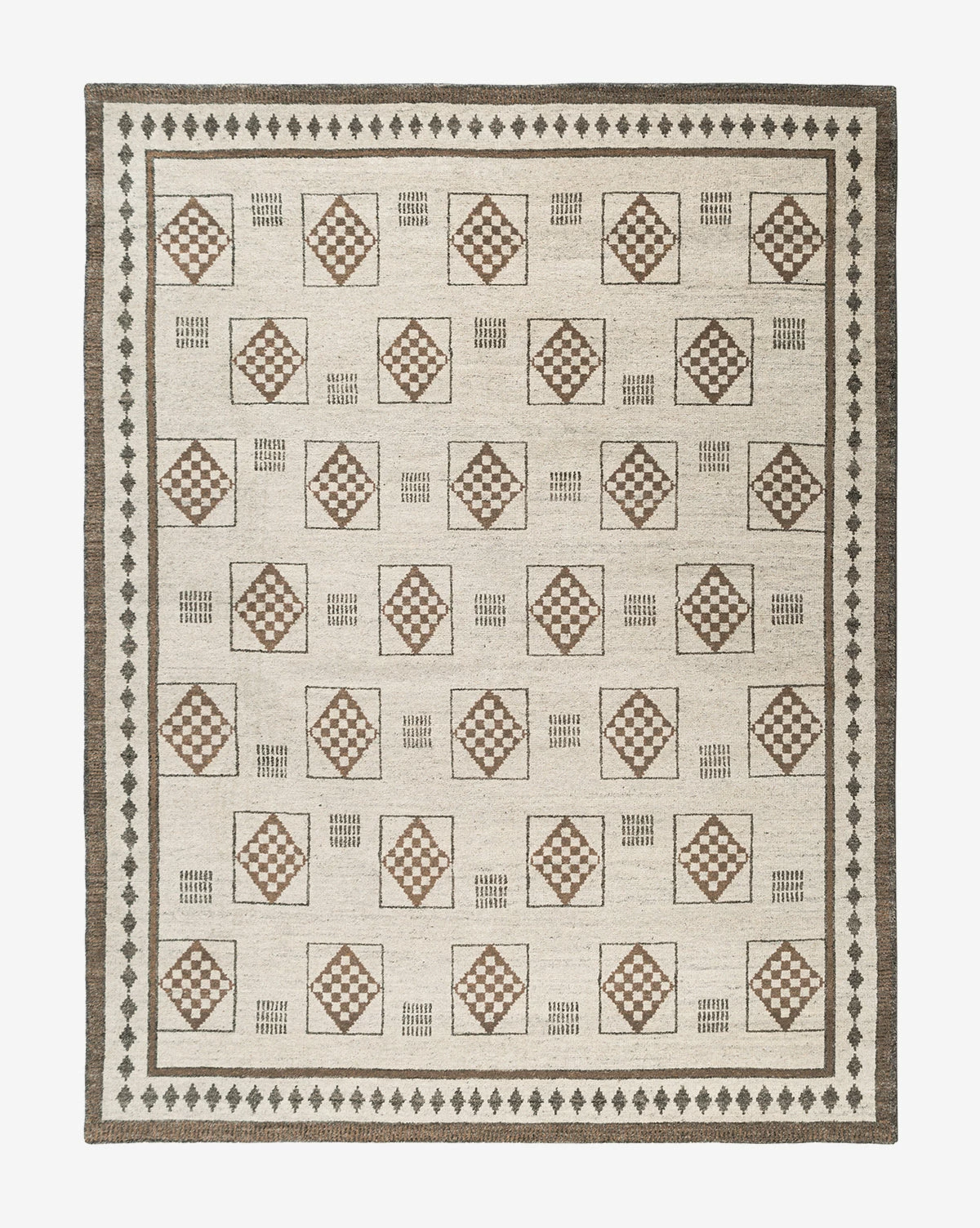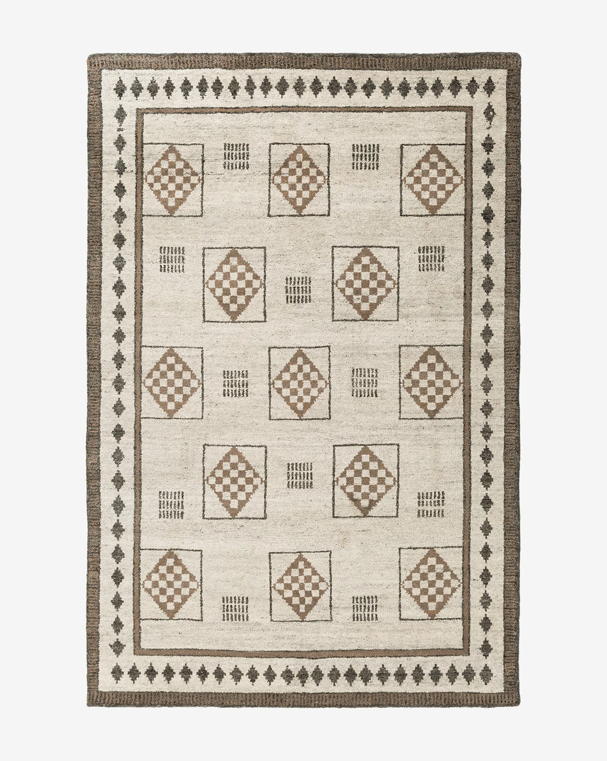 Hand-knotted from 100% wool with a neutral palette, the Melville Hand-Knotted Wool Rug features a geometric pattern. Its crisp design is detailed and approachable, with contrast given by varied hues and shapes that lend motion to the textile.