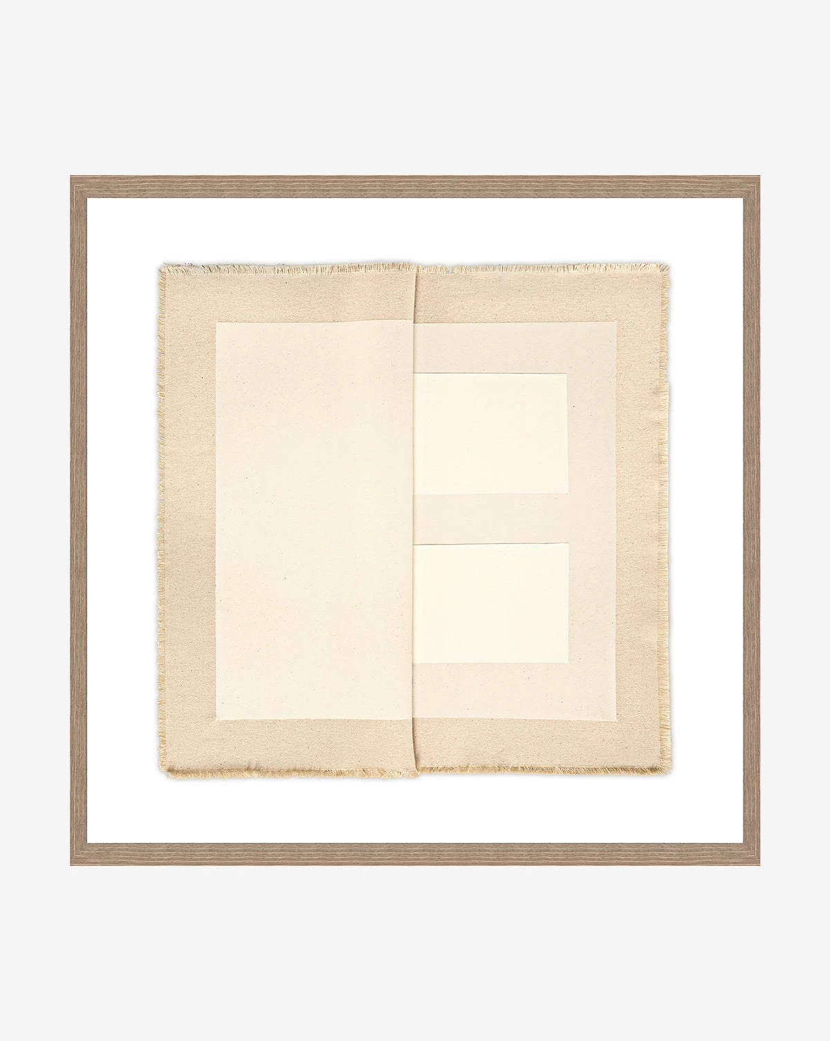 With three-dimensional texture, Mind Division II is a hand painting on fabric. Its frayed edges and folded element bring dimension and detail wherever it is placed. Framed in natural wood, museum-quality materials elevate your decor. Â