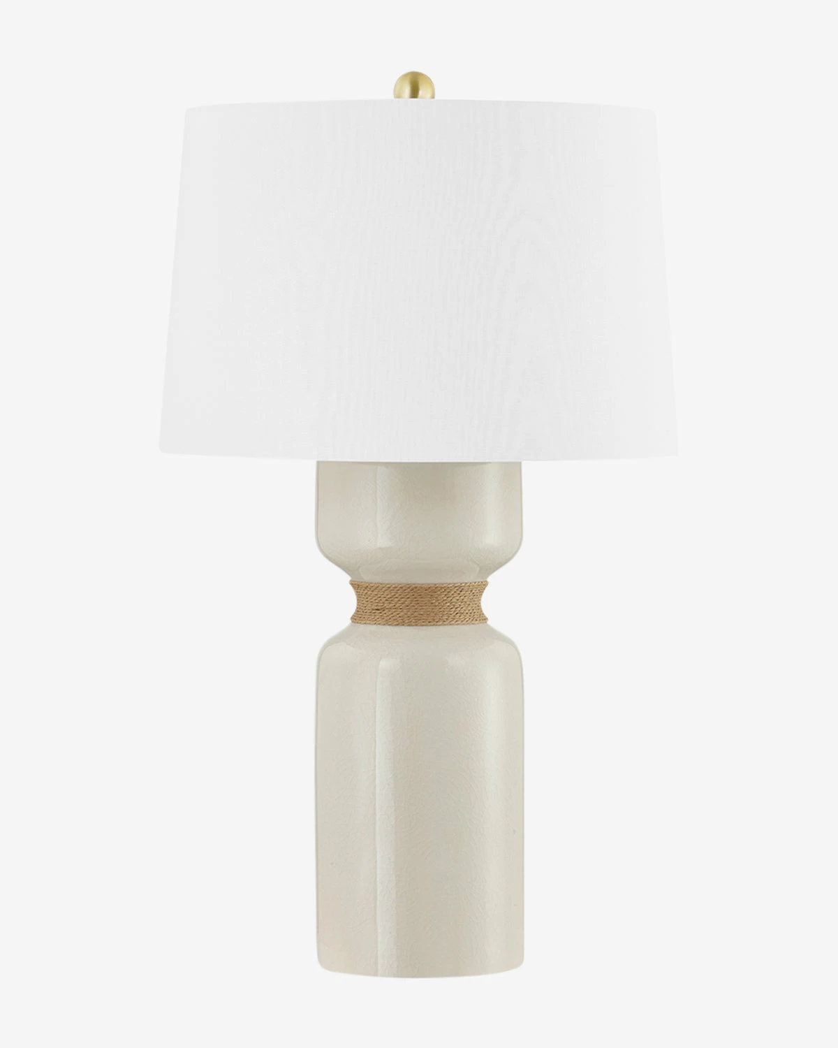 With a masterfully designed ceramic base, the Mindy Table Lamp is both sleek and sculptural. Its tapered white base is complemented by wrapped rope in the center while the linen shade features an aged brass finial, adding a unique mix of materials to your decor.
