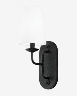 With an oval backplate and tapered white linen shade, the Moe Wall Sconce has a handmade feel inspired by vintage pieces. In either a black iron or white gesso finish, this updated take on a traditional lantern design brings warmth to any room of the home.