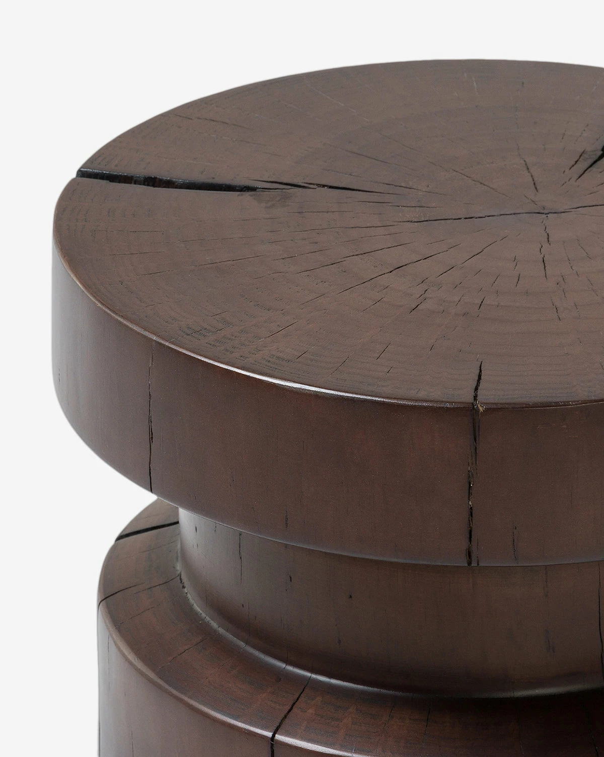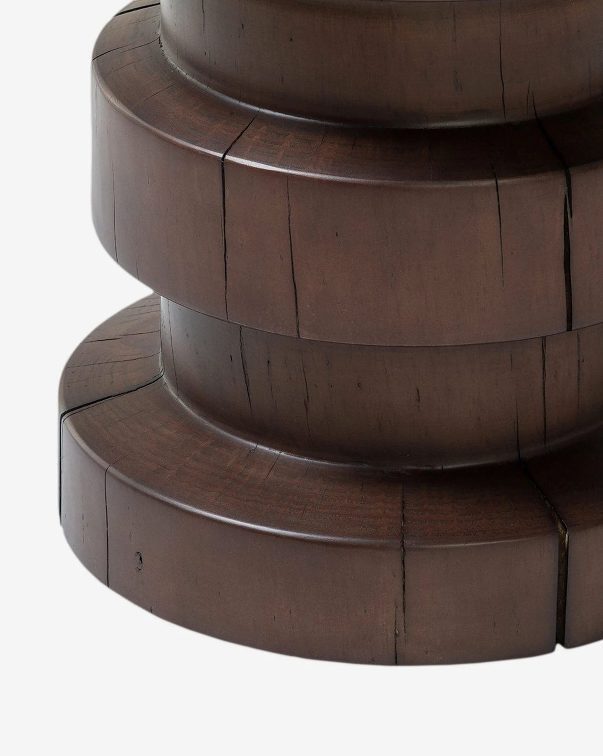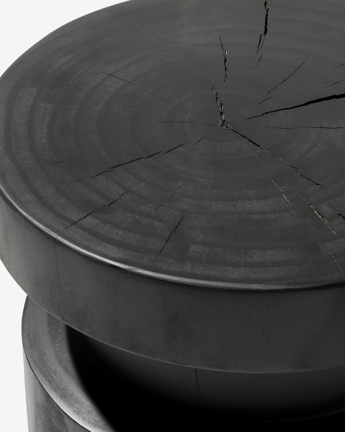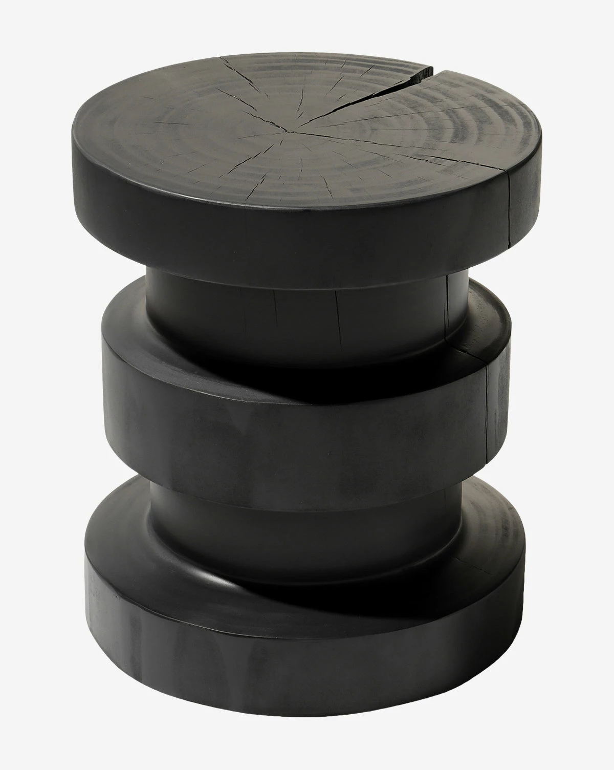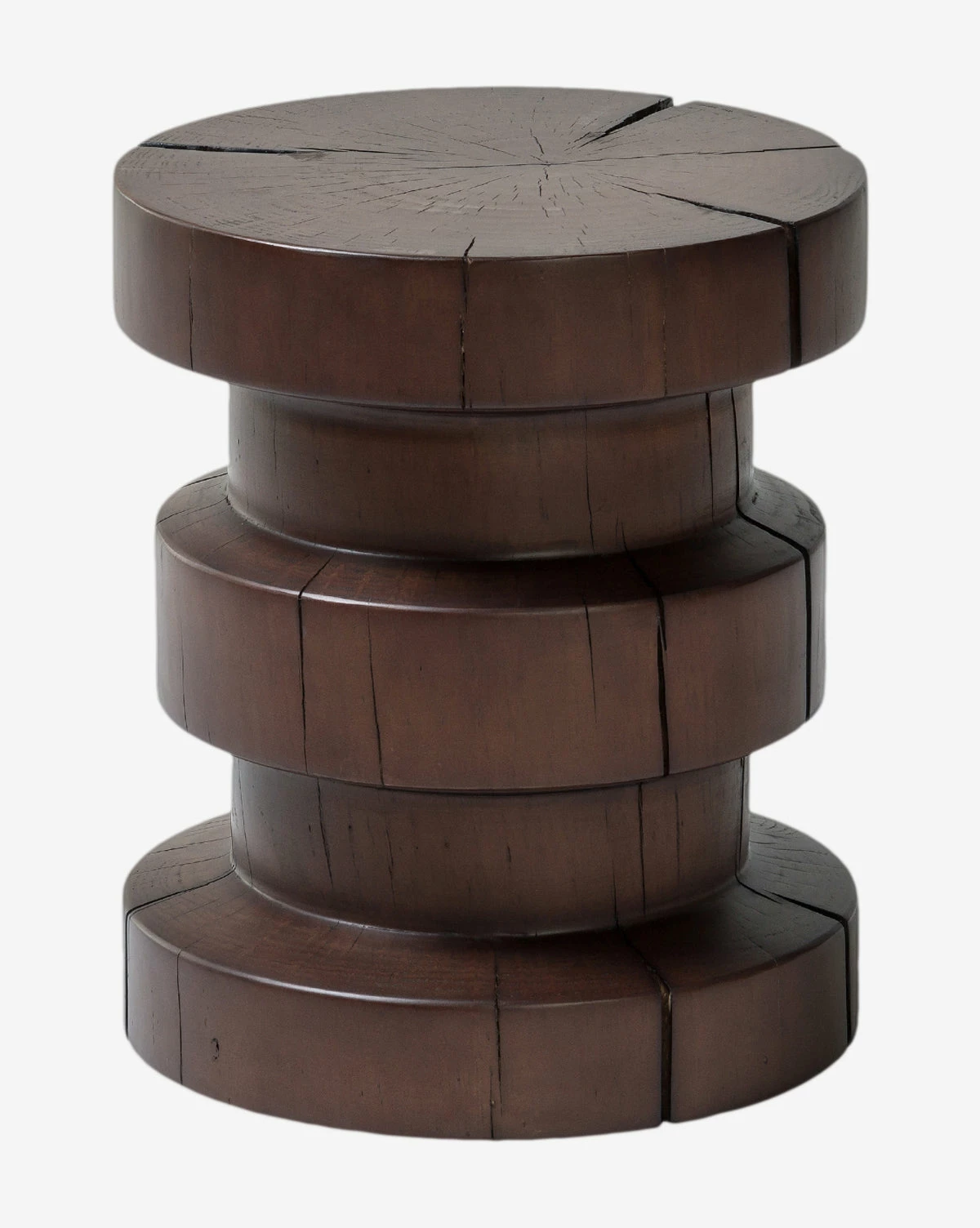 With both organic and modern elements, the drum-style Moreno End Table is crafted from solid pine in a black or brown finish. Its dramatic form is dimensional and clever, with a sculptural quality that gives the piece an artistic touch. Each Moreno End Table will vary, as the natural pine has unique knots and cracks that contribute to the character of the table.