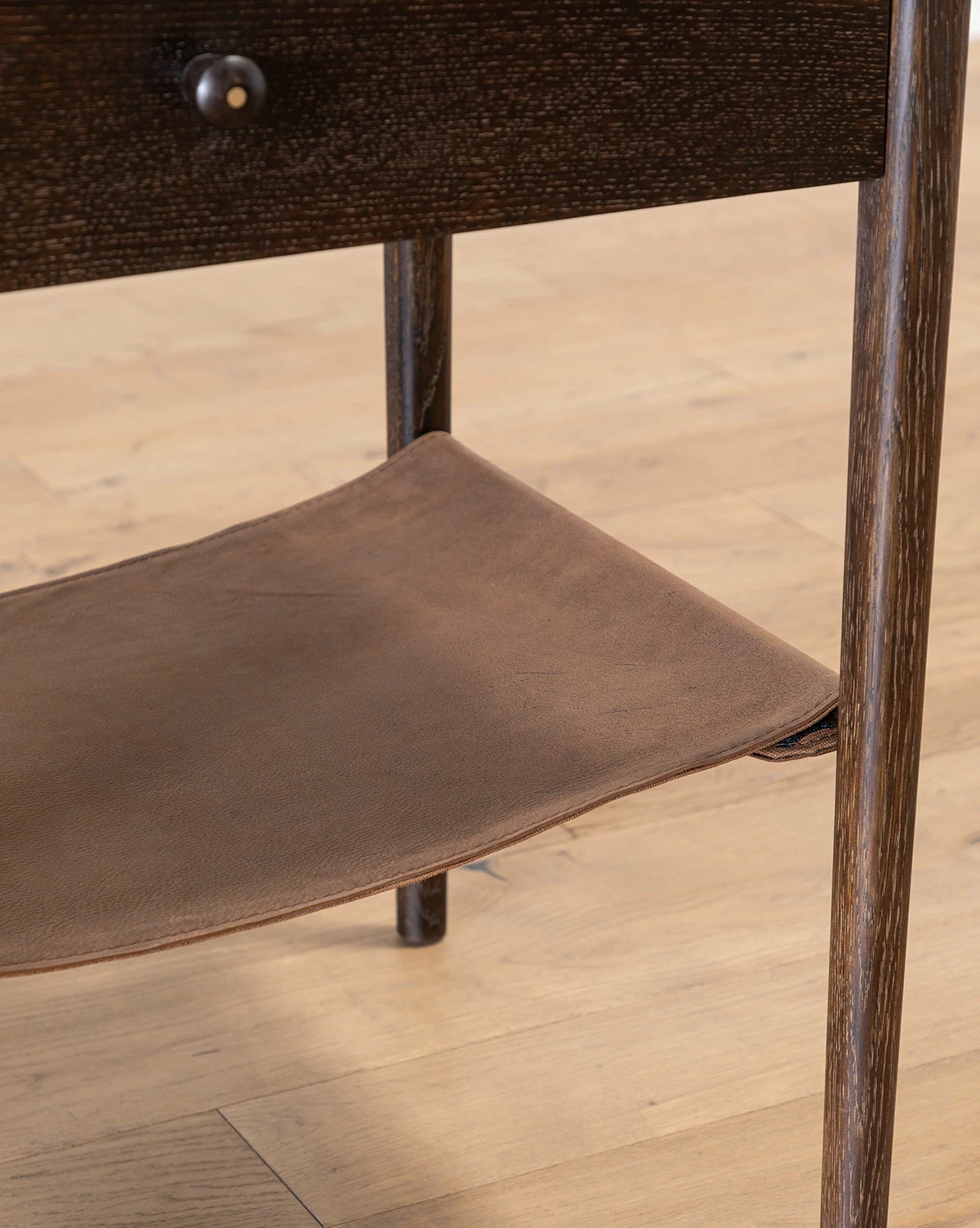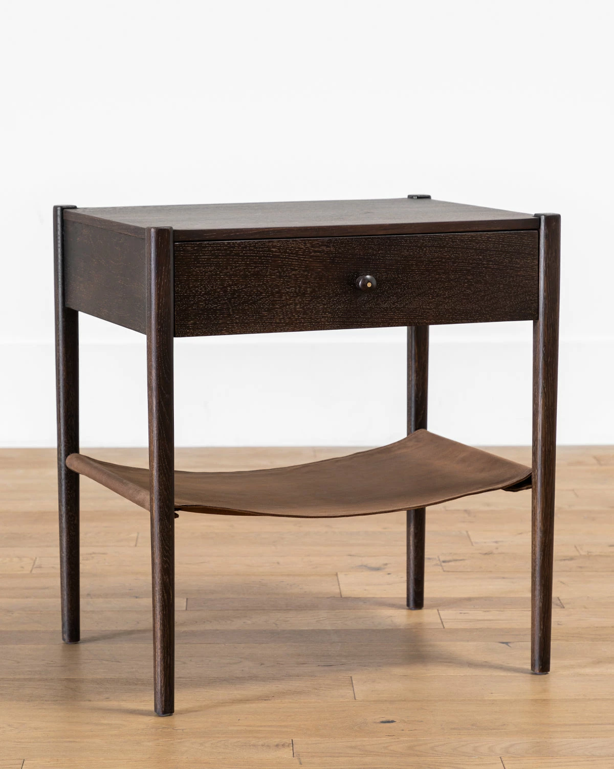 Crafted from oak in a dark brown finish, our Nathan Oak Nightstand is refined and subtly textural. A loose top grain leather shelf perfectly complements the simple drawer with its small round pull. The moody tones and natural materials of the nightstand bring a sophisticated feel to bedroom styling.