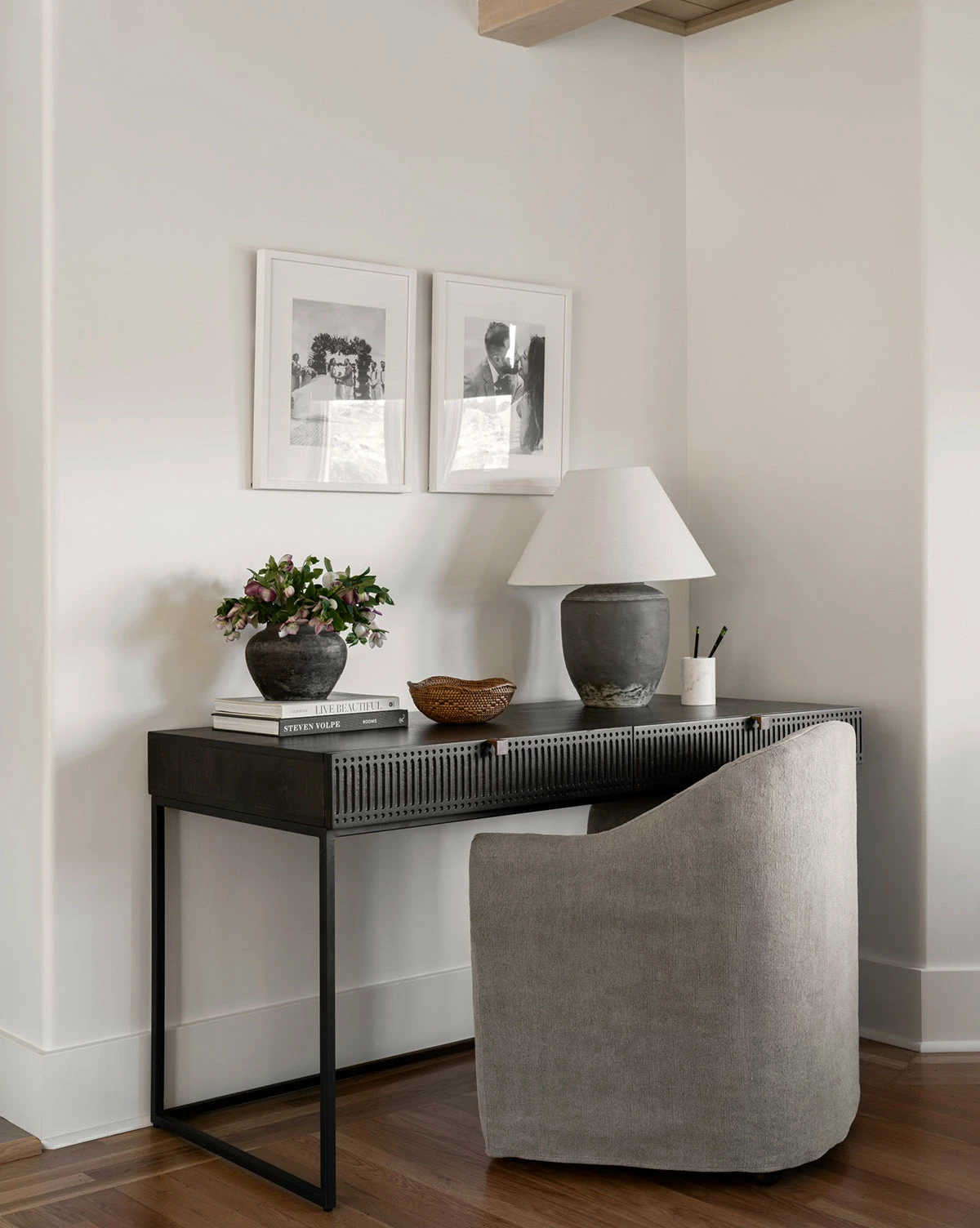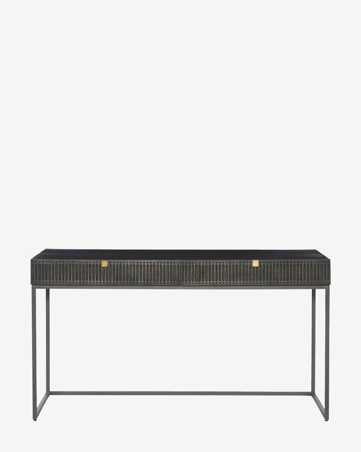 Expertly crafted with an artisan feel, the Nevan Writing Desk features unique linear carvings bringing dimension to its simple form. Two drawers provide just enough room for desk storage, as slim iron legs combine with the textured wood frame for an airy, contemporary look.