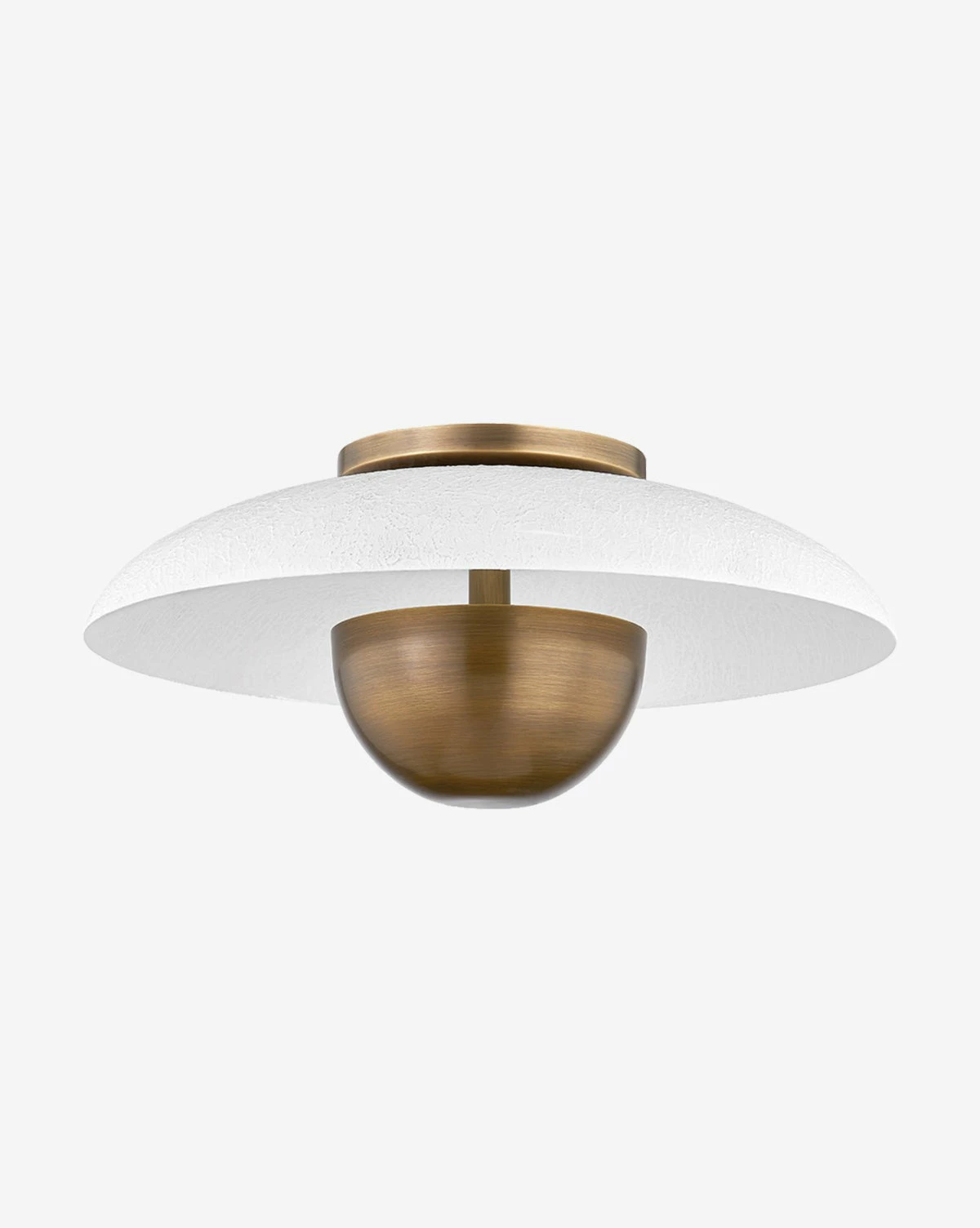 In a classic design, the thoughtful mix of materials in the Noah Flush Mount gives it a unique beauty. The round and shapely flush mount is made from patina brass and white gesso, bringing sophisticated detail to your space.