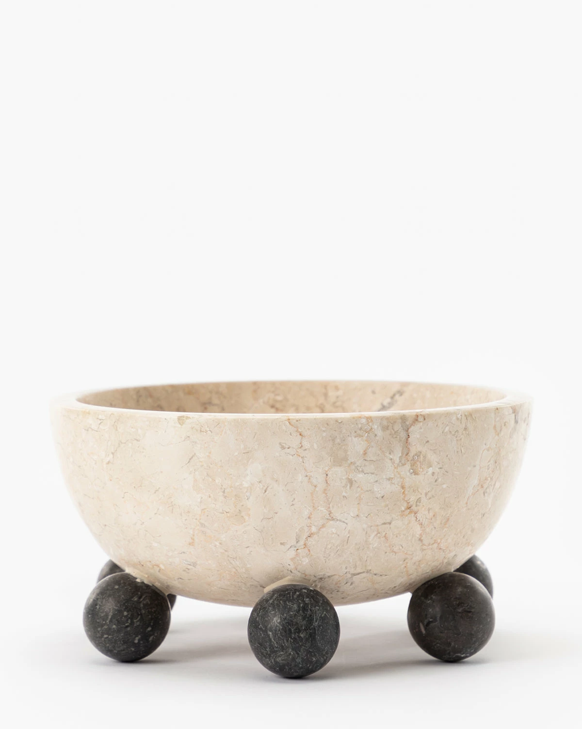 A wide circular bowl stabilized on gray marble spherical feet, the Posie Marble Bowl is modern and sculptural. The natural tone of the marble bowl is complemented by the darker feet, both featuring beautiful organic details.