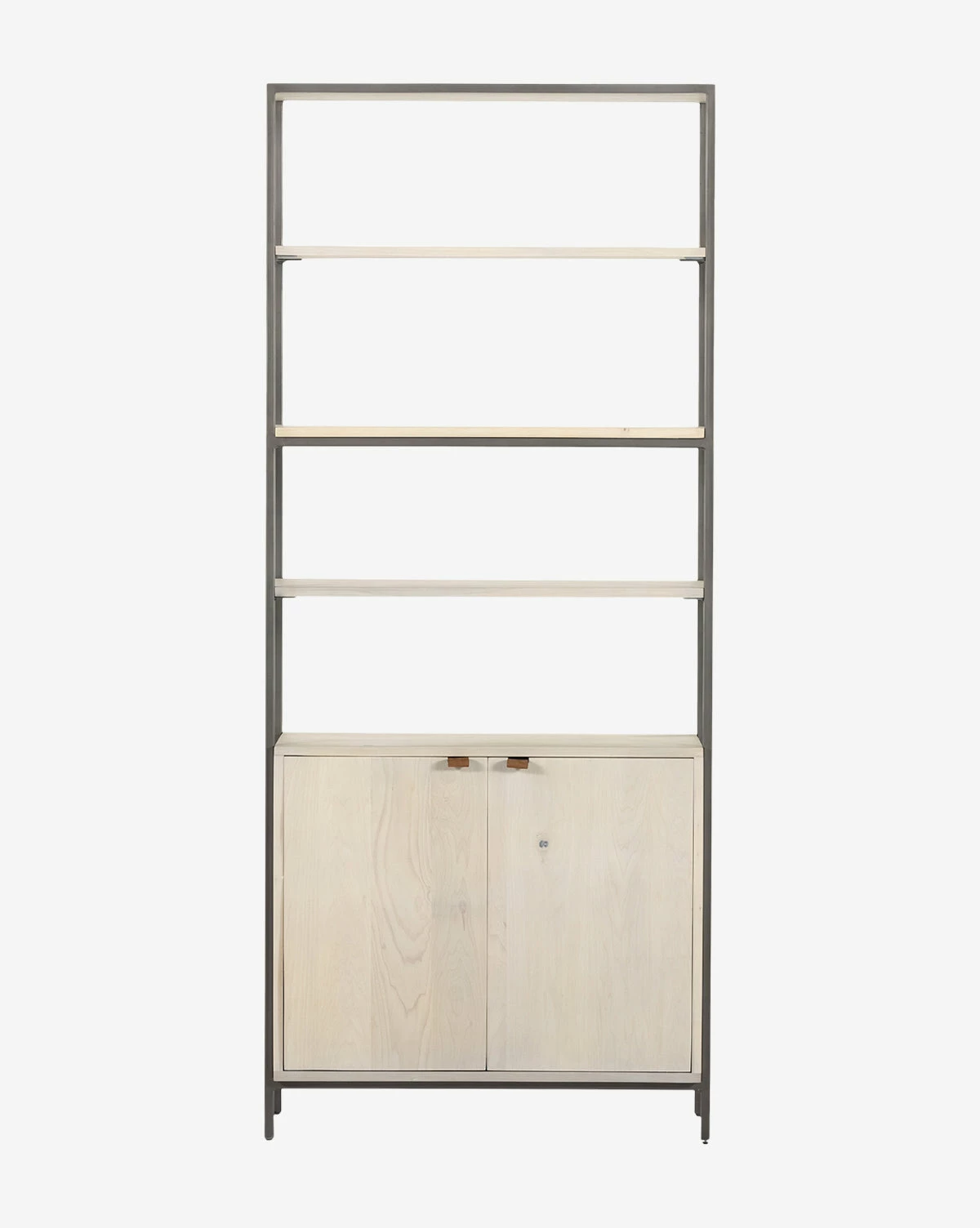 The perfect combination of open and hidden storage, our Noland Wide Bookshelf offers a sophisticated element to your living space. Crafted from a modern mix of materials, its iron construction is contrasted with leather drawer pulls. With a broad width, this bookshelf lets you display your heirlooms with pride, while keeping other items out of sight.