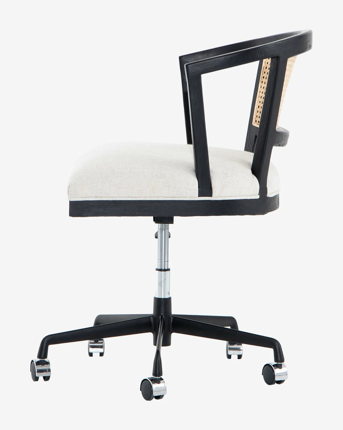 A refreshing take on a mid-century inspired chair, the Norma Desk Chair blends materials and tones in a rounded silhouette. Its frame is available in three finishes, holding a back pane of caning that lends dimension to the chair and resting on practical rolling wheels.