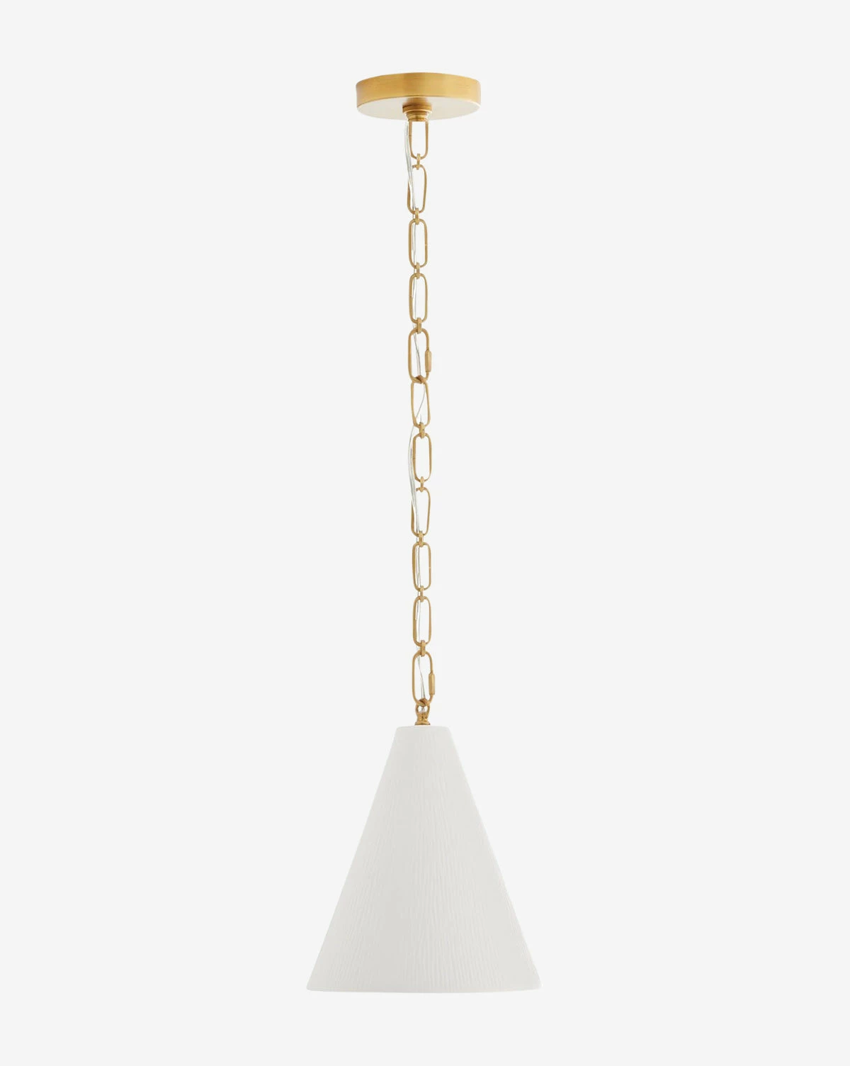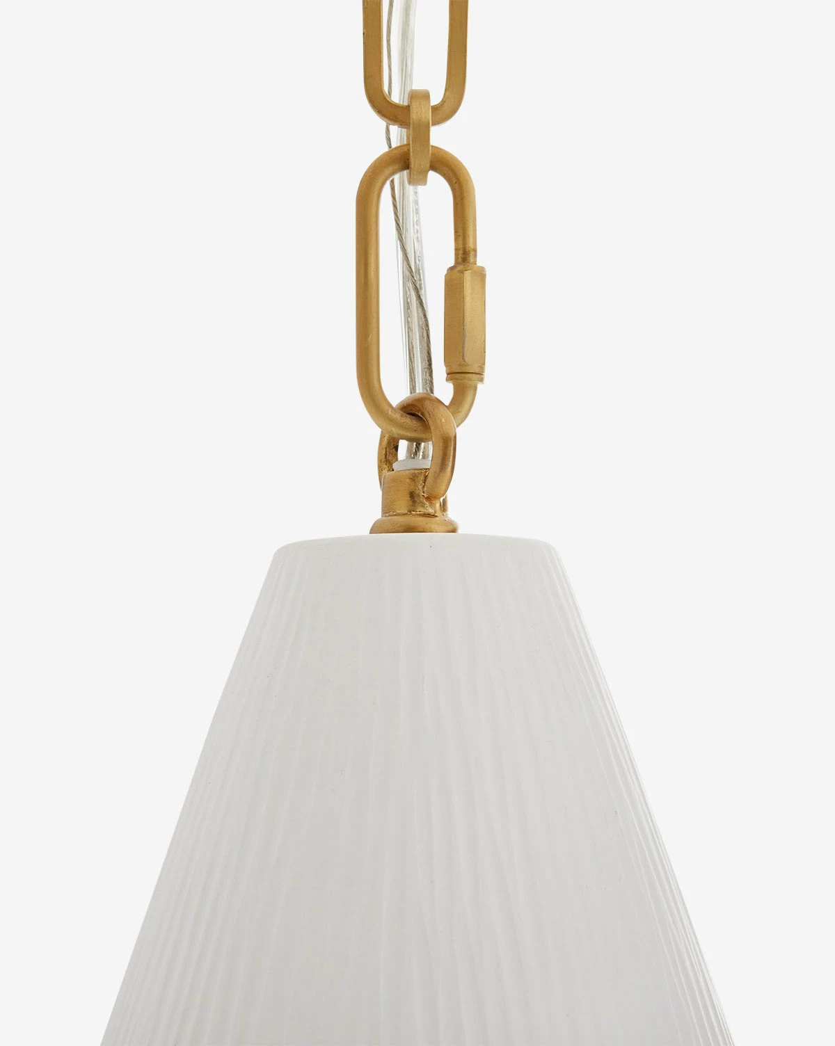 With a conical porcelain shade, the Oakland Pendant brings unique materials to traditional lighting. When illuminated, the pendant highlights the chiseled texture of the shade, adding depth to its clean aesthetic. An antique brass steel link chain brings contrast and warmth to the matte bone porcelain.