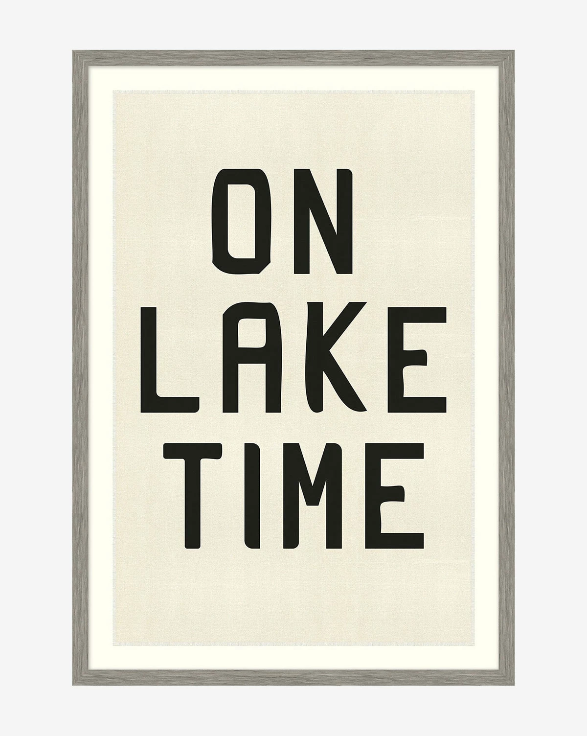 With the feel of a vintage camp flag, On Lake Time brings power and simplicity to your decor. The giclee print on raw canvas has frayed edges and is mounted on a mat in a shadowbox, for extra textural display and a refined gallery feel. Â