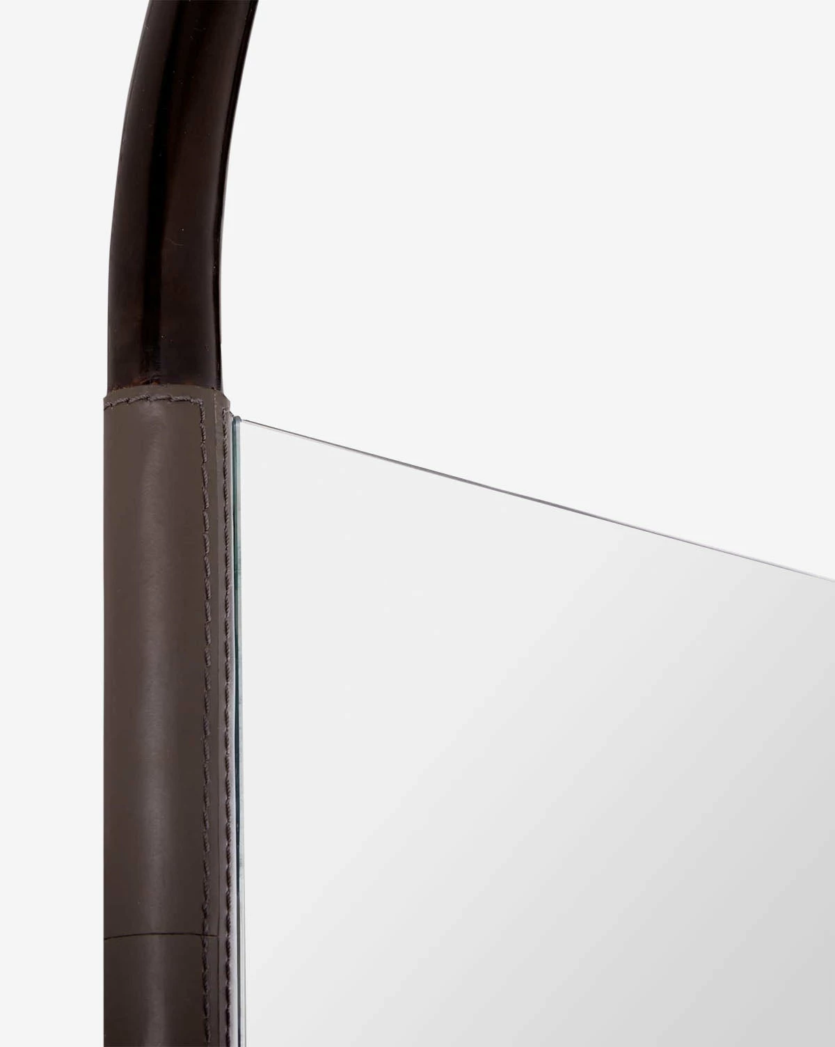 Graceful and unique, the Open Arched Floor Mirror brings an elegant mix of materials to any room. A simple arched frame features graphite leather and blackened bronze steel with a brass accent at the top.