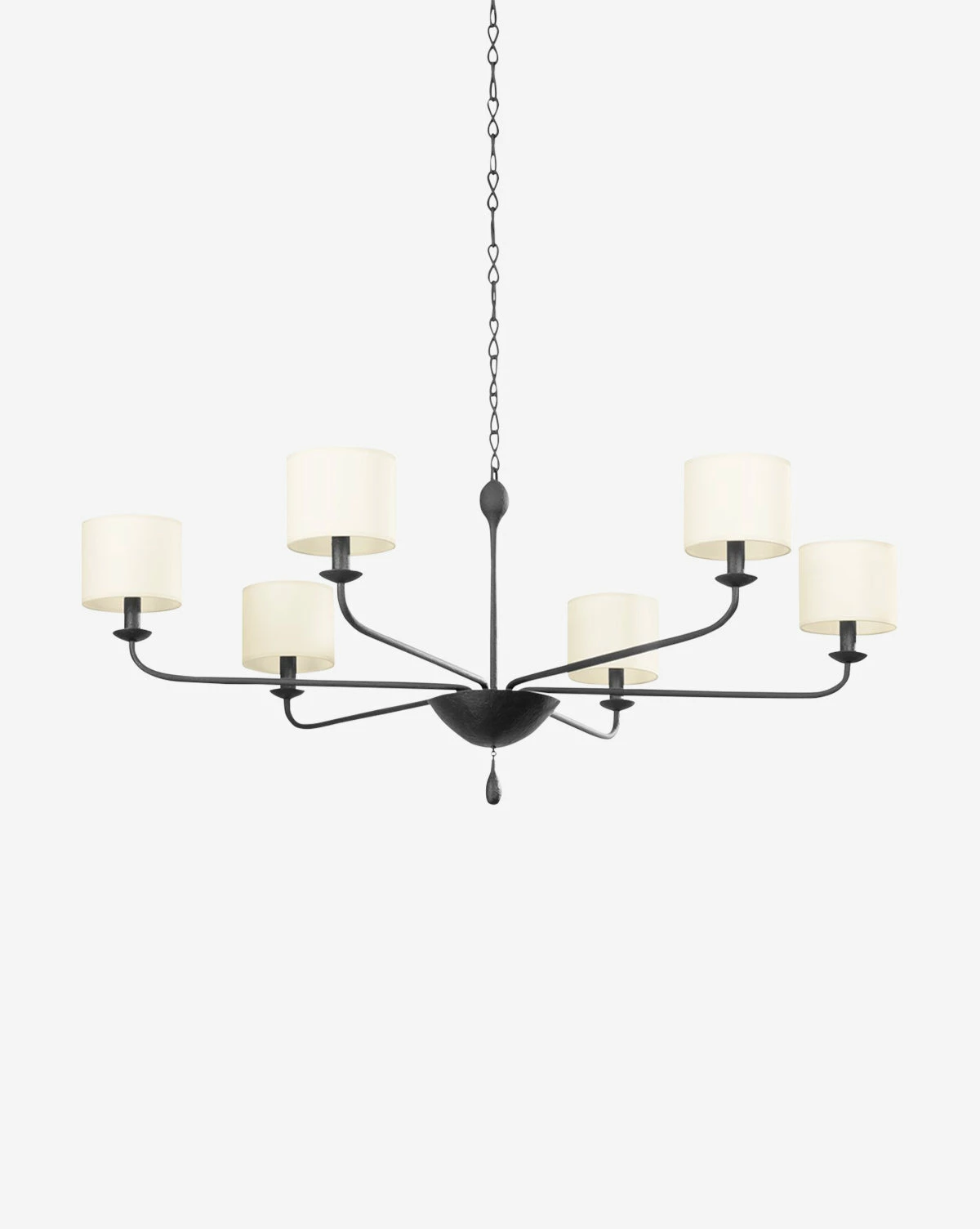 Transitional by design, the Osmond Chandelier makes its presence known in both modern and traditional spaces with its distinctive appearance. Featuring six candelabra bulbs within drum shades, the textured black iron structure provides a welcome contrast.