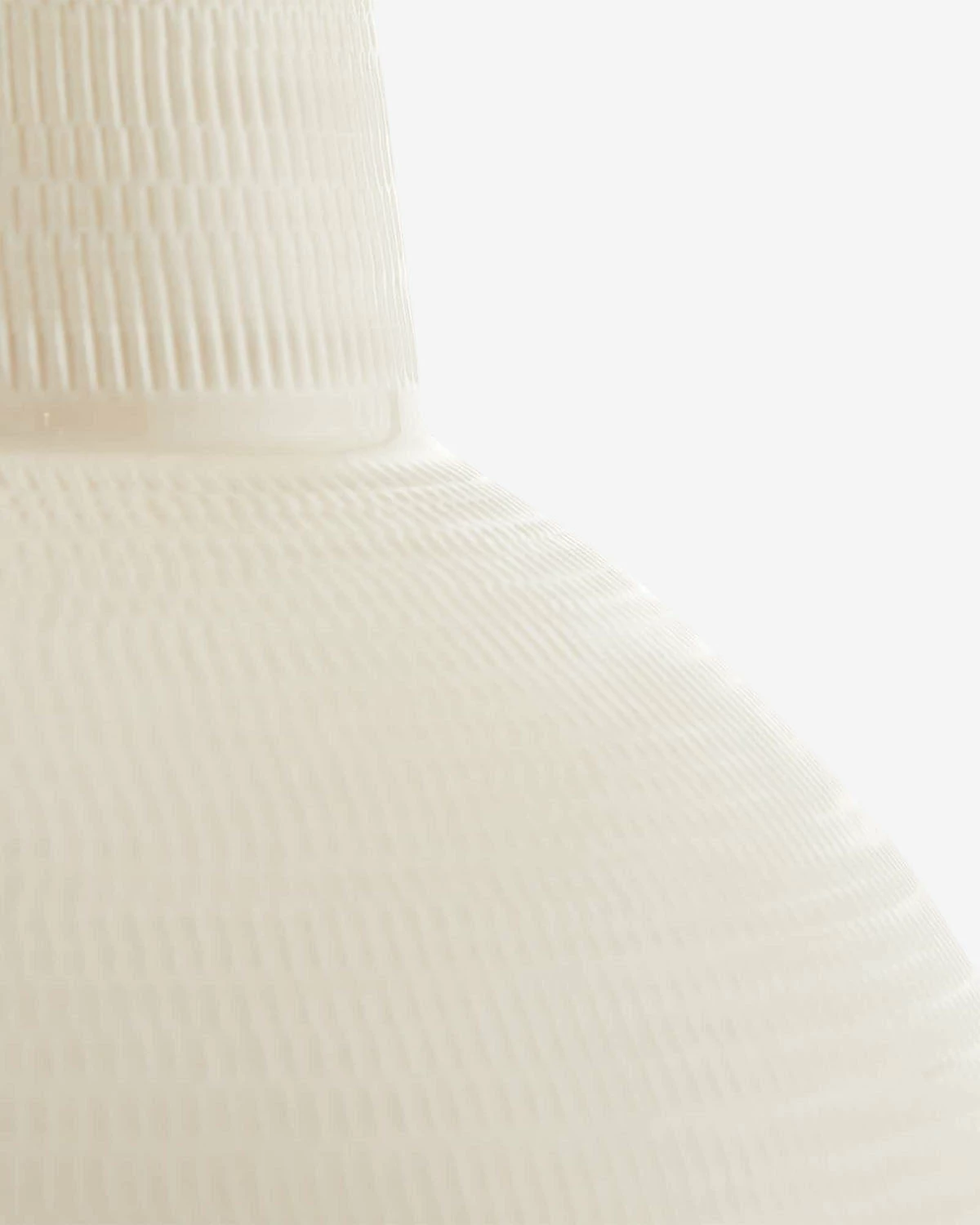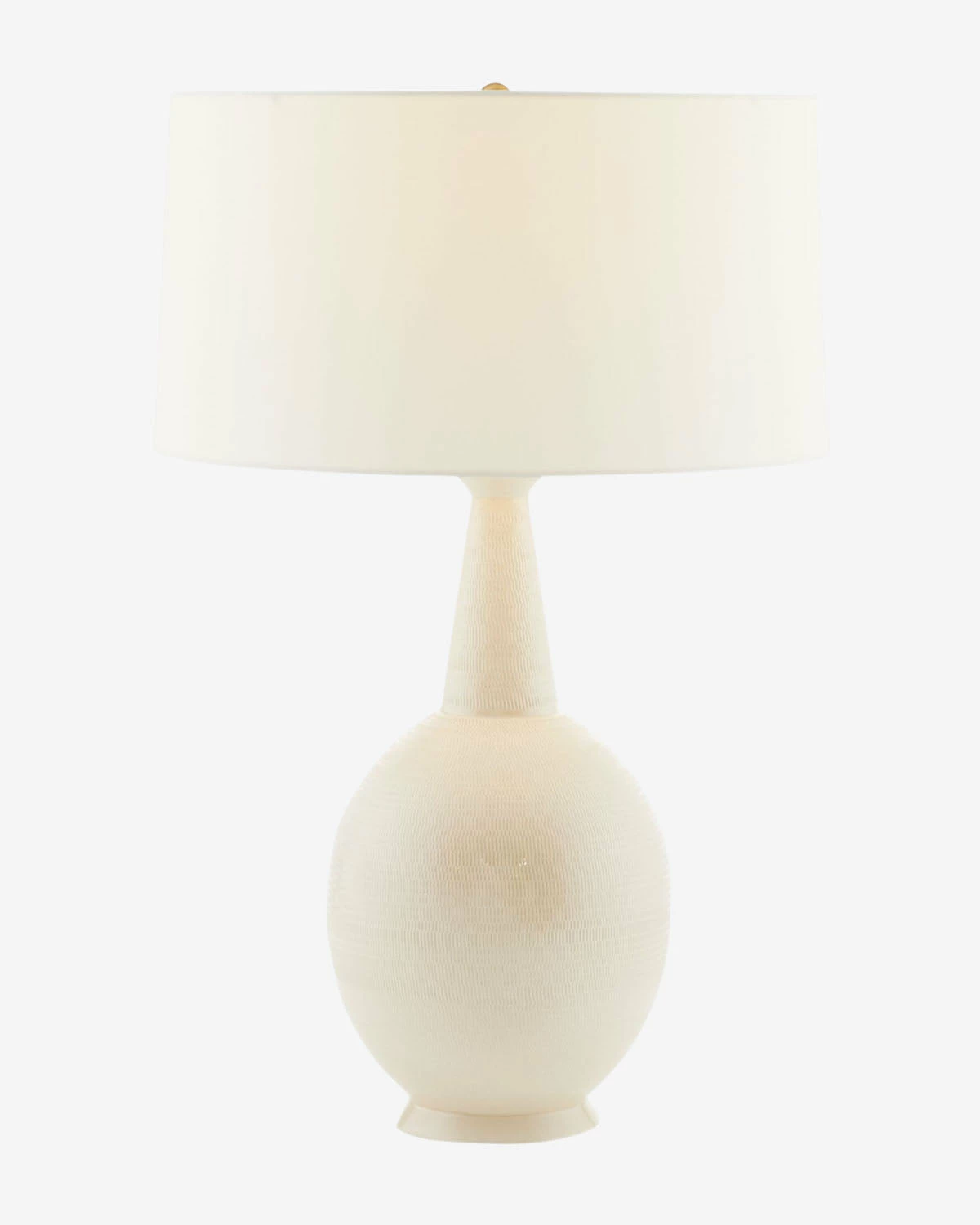 In a sculptural form, the Padget Table Lamp is crafted from porcelain and finished in an oat glaze. A wide shade made of white cotton adds balance to the shapely base and allows for warm light wherever the lamp is styled.
