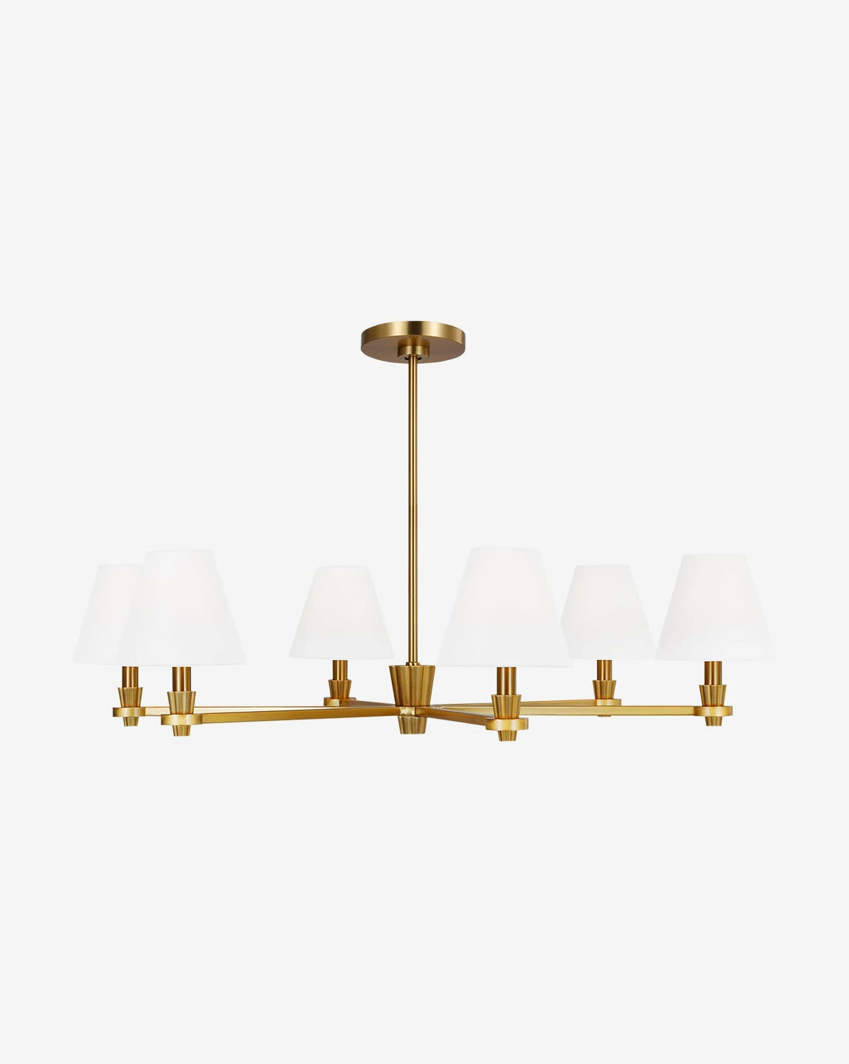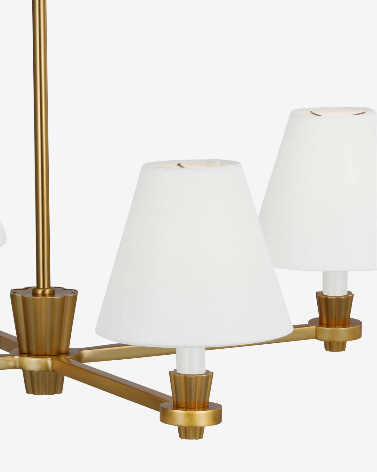 With a traditional silhouette, the Paisley Chandelier brings simplicity to your decor with sleek modern elements and a bold finish. The white linen fabric shades provide a welcome contrast to the structure and add soft lighting to your space.