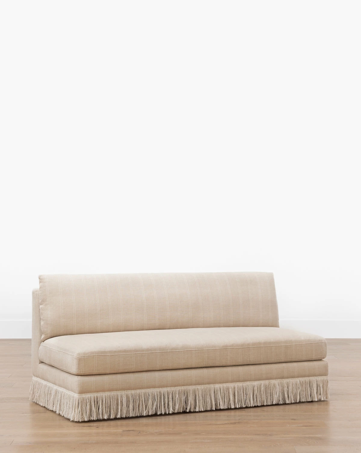 Inviting and modern, our Philippa Settee welcomes rest while seamlessly lending a playful feel to the home with its stripes and fringe. With an oatmeal and ivory striped coated linen upholstered over luxurious cushions, the settee makes a statement anywhere it is styled.