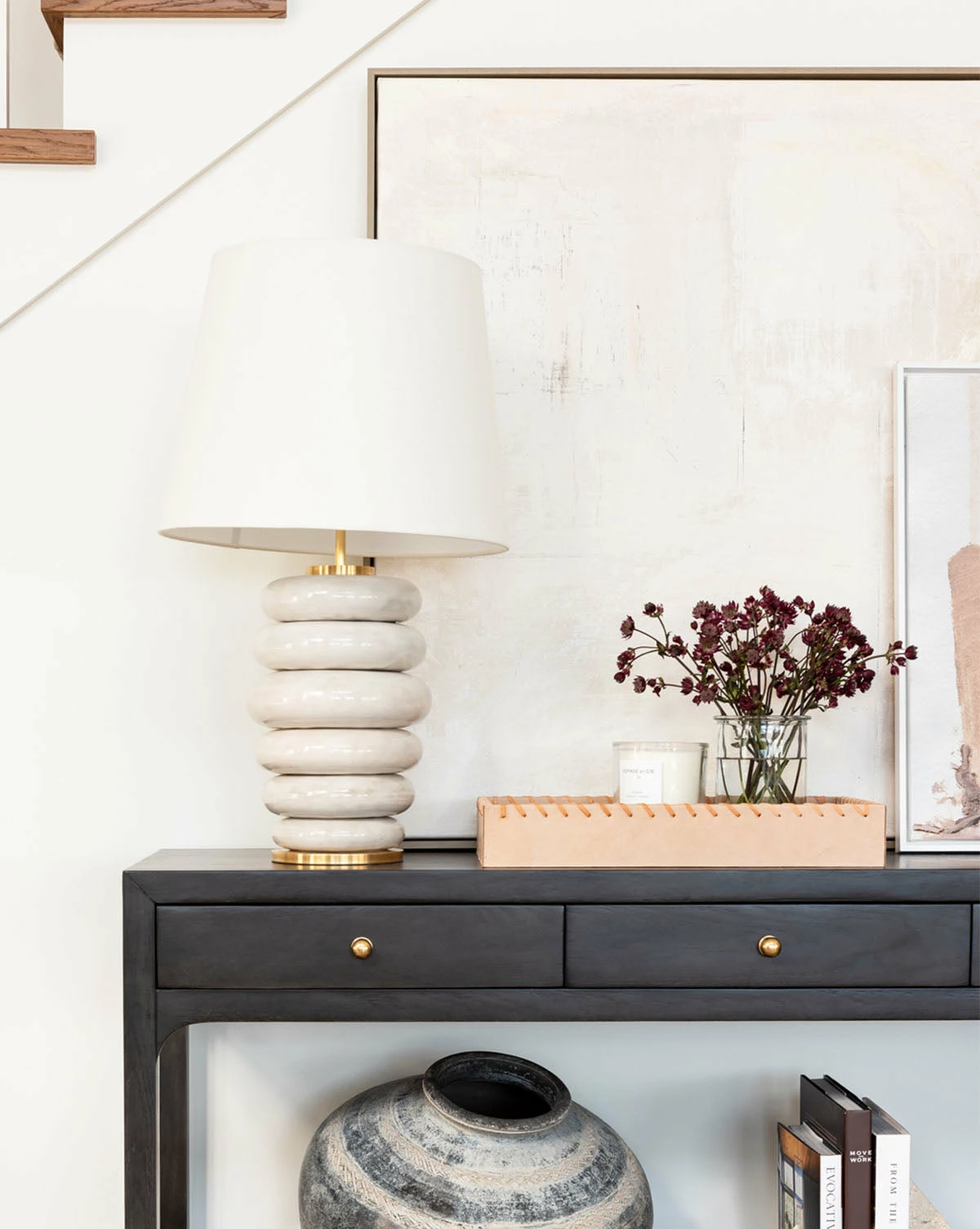The Phoebe Stacked Table Lamp’s dramatic form is enhanced in both of its thoughtfully chosen finish.  Add warm and sultry tones or cool and elegant aesthetic with its crystal bronze or antiqued white finish options.