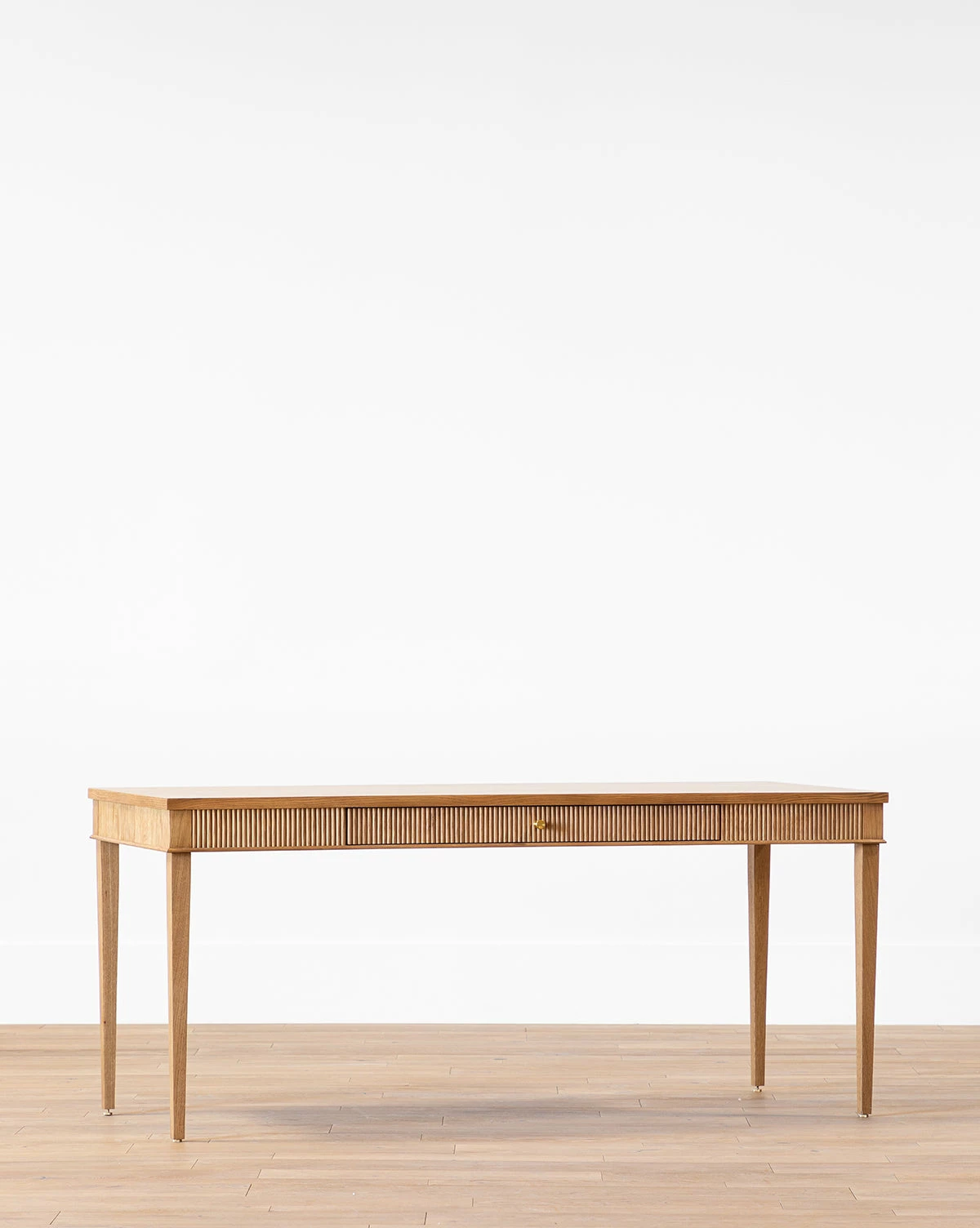 Featuring subtle reeded detail, the Pieter Desk brings a touch of texture to home offices. Its neutral finish and tapered legs give warmth and interest without overwhelming the space, and its concealed drawer with brass hardware adds practicality to its design with inconspicuous storage space.