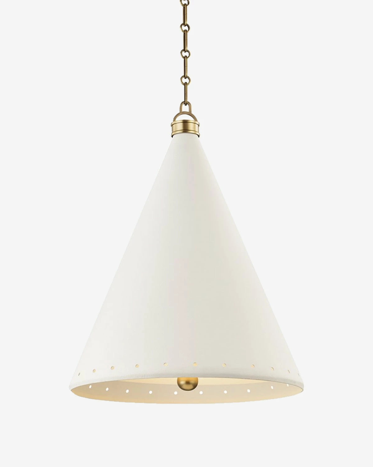 Classic and modern at the same time, this cone-shaped pendant is sure to become a fast favorite styled over your kitchen island. Circle cutouts line the rim of its steel shade to add a touch of dimension to the simple form, while aged brass details complete the design with an elegant touch.