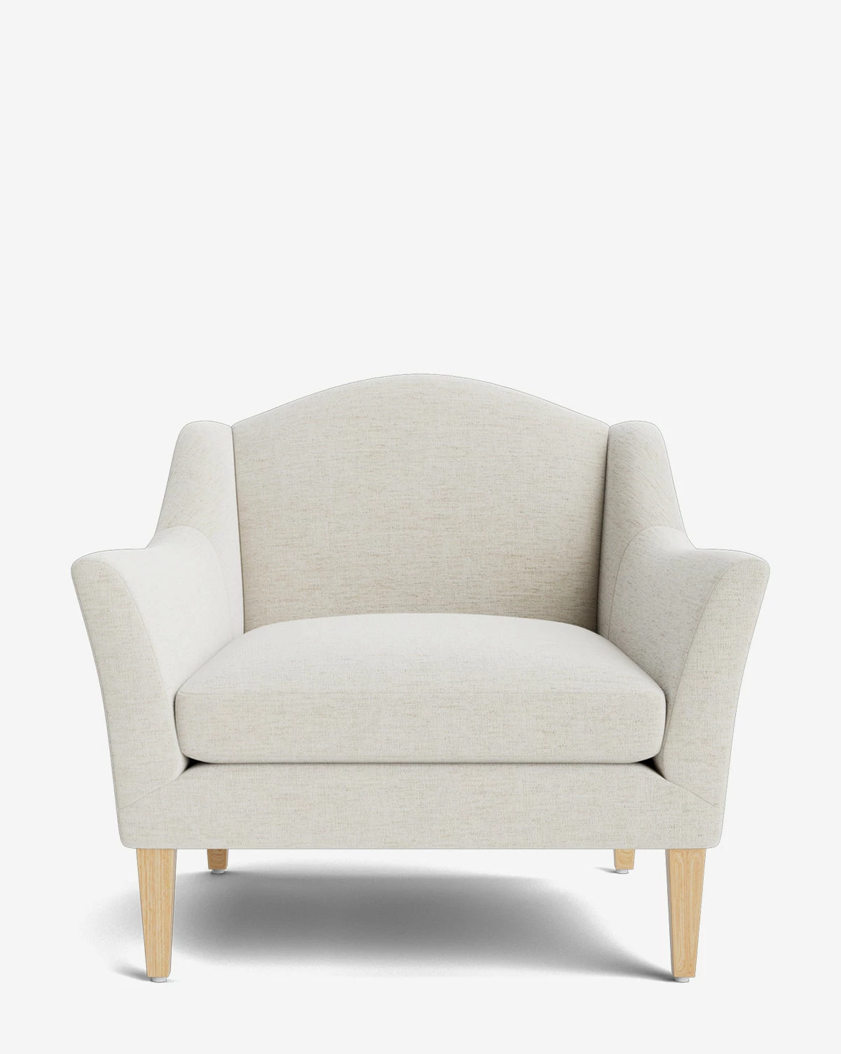 Made to order with a classic silhouette, the Prudence Chair has tapered oak legs that hold its frame with elegantly curved arms and a rounded top. Designed to complement and elevate your home, the chair is available in a selection of high-quality fabrics that highlight its timeless structure.