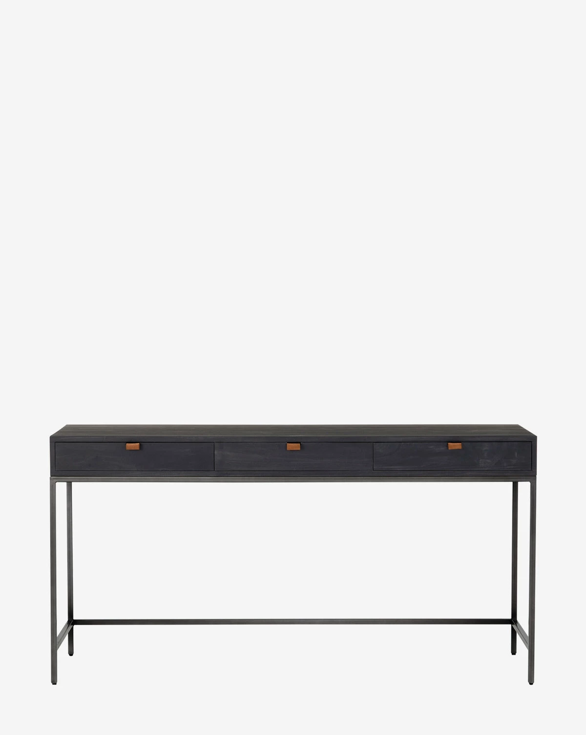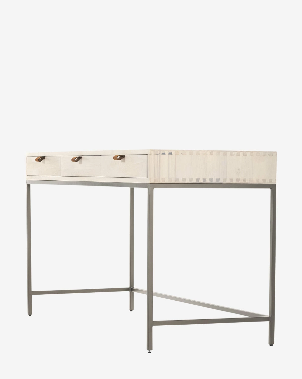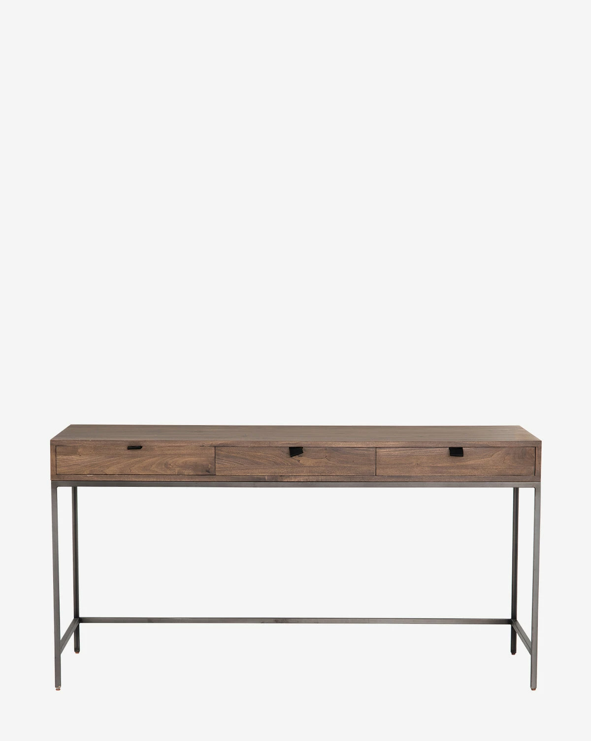 Mixed materials make a statement in the airy and straightforward design of the Rayne Writing Desk. Leather pulls lend access to three drawers for storage, while its poplar wood desktop is filled with natural grains and knots for dimension. Sitting atop a base of sleek iron, this desk’s charcoal, chestnut or dove hue adds depth without overwhelming your office.