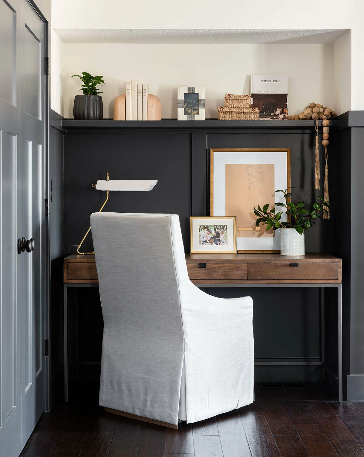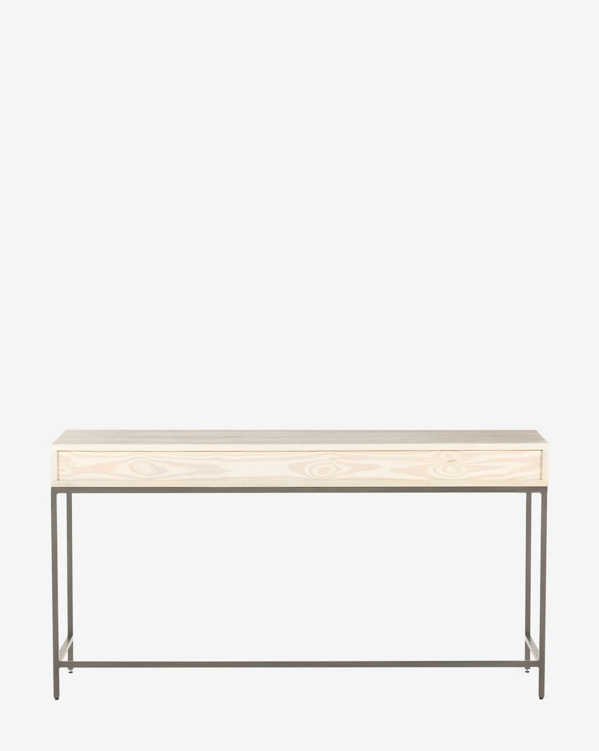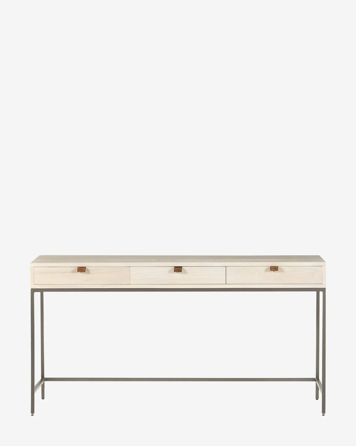 Mixed materials make a statement in the airy and straightforward design of the Rayne Writing Desk. Leather pulls lend access to three drawers for storage, while its poplar wood desktop is filled with natural grains and knots for dimension. Sitting atop a base of sleek iron, this desk’s charcoal, chestnut or dove hue adds depth without overwhelming your office.
