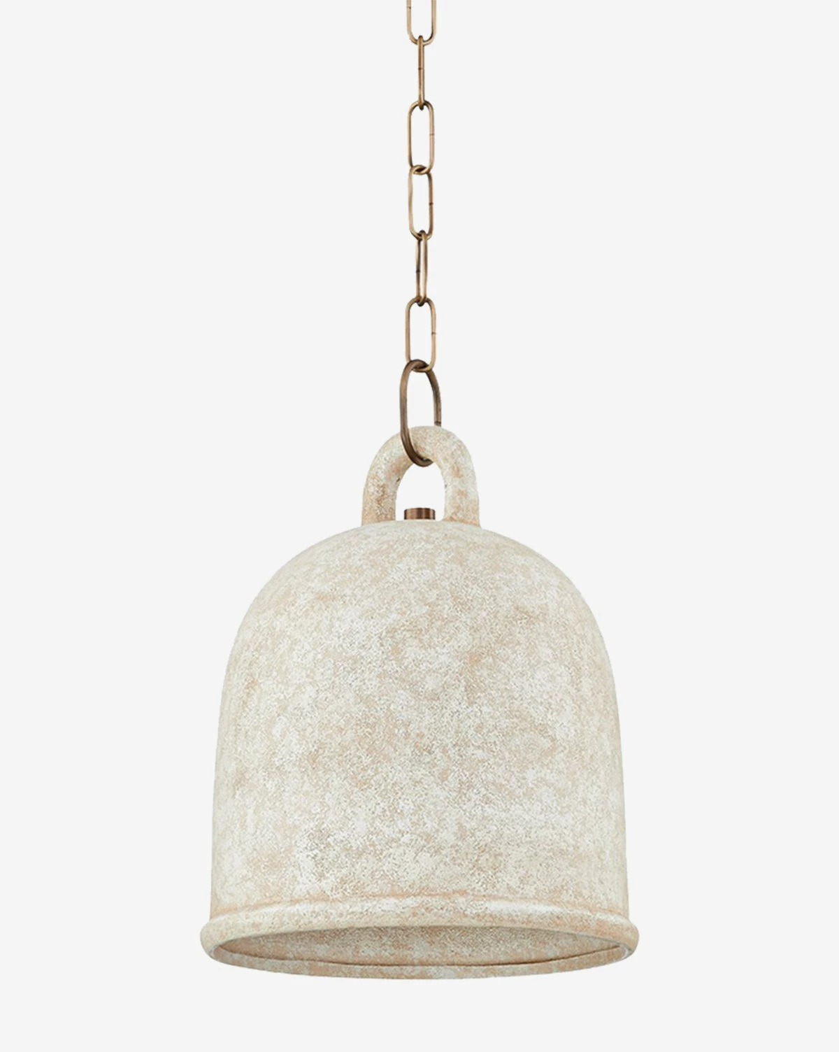 The Relic Pendant brings a contemporary yet approachable style to your space with its bell shape and seamlessly mixed materials. A patina brass chain holds a neutral ceramic shade, making a statement in your home.