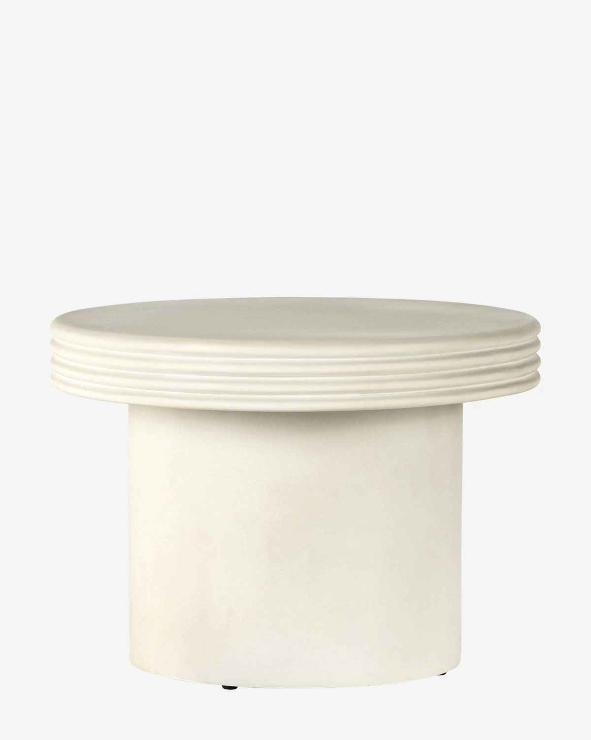 Sculptural and dramatic, the Riah End Table brings its simple structure and bold features to your styling, whether indoors or outdoors. Made from concrete in a white finish, the ribbed edging on the tabletop adds subtle dimension to the cylindrical base.