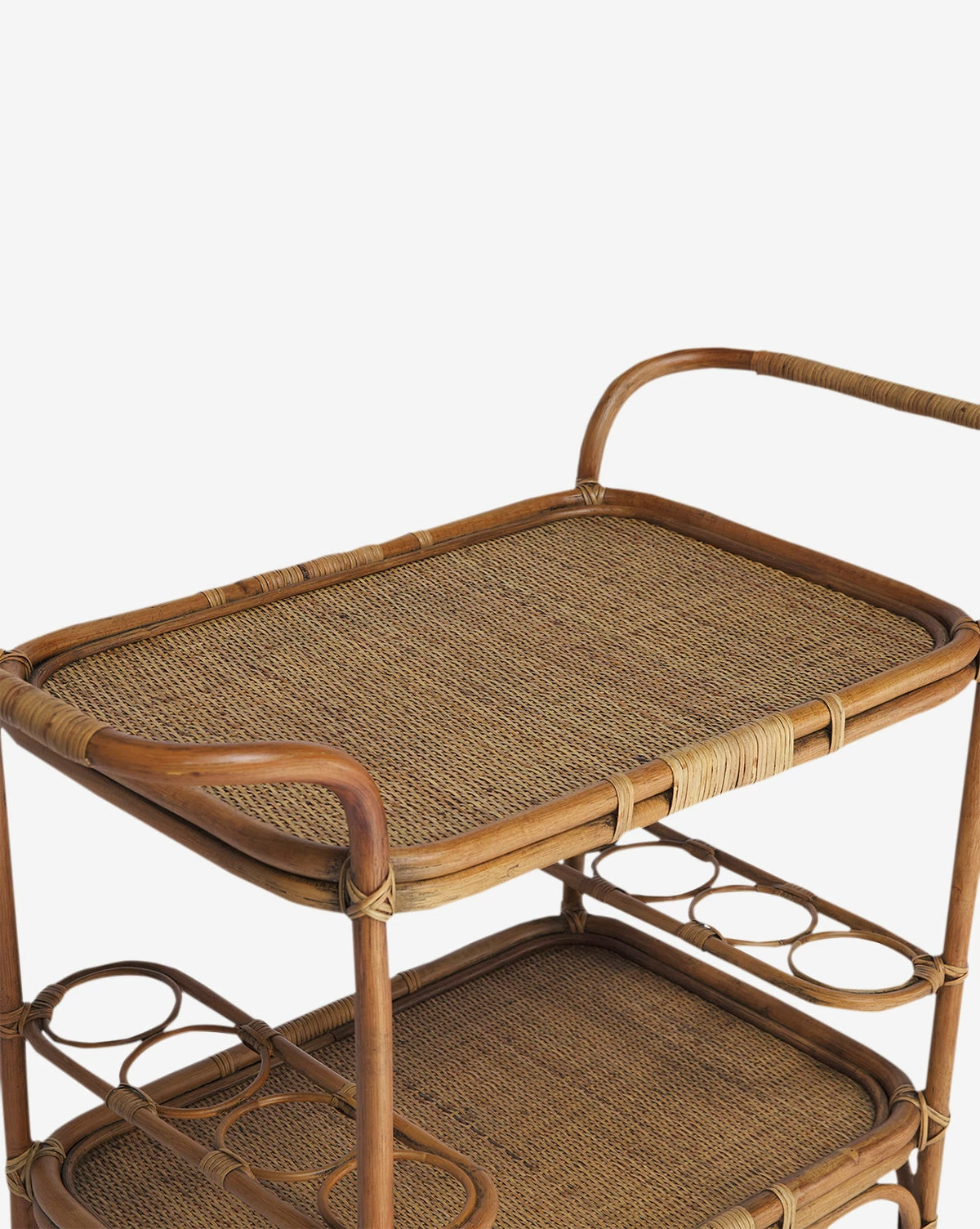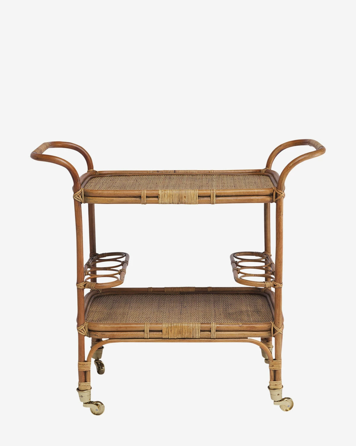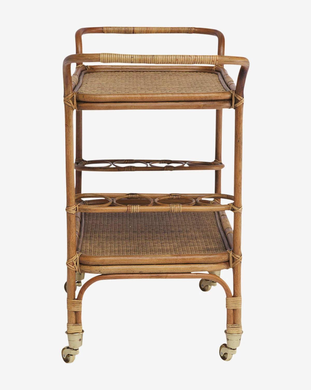 Mid-century meets modern with the Ridgeway Bar Cart. This two-tiered cart is handcrafted from natural rattan, featuring smaller woven details and curved handles. Whether styled with decor or your go-to glassware, the bar cart is a playful addition to your space.