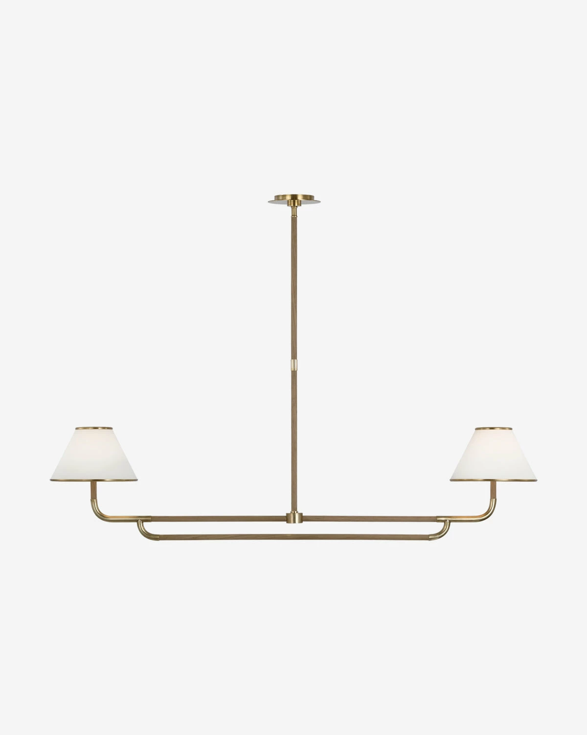 With a modern silhouette, the Rigby Linear Chandelier brings simplicity to your decor with a unique mix of materials. The white linen fabric shades are accented by wood arms that contrast the metal structure in two bold finishes.