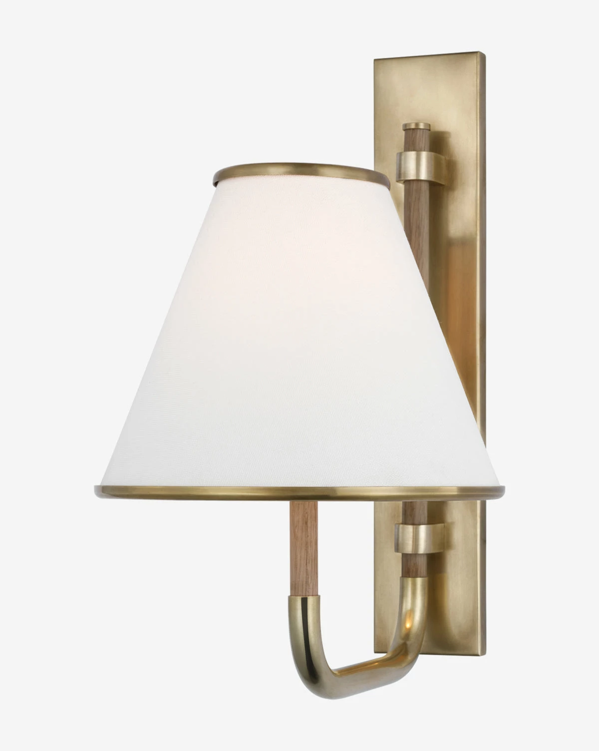 With a modern silhouette, the Rigby Sconce brings simplicity to your decor with a unique mix of materials. The white linen fabric shade is accented by a wood arm that contrasts the metal structure in two bold finishes.