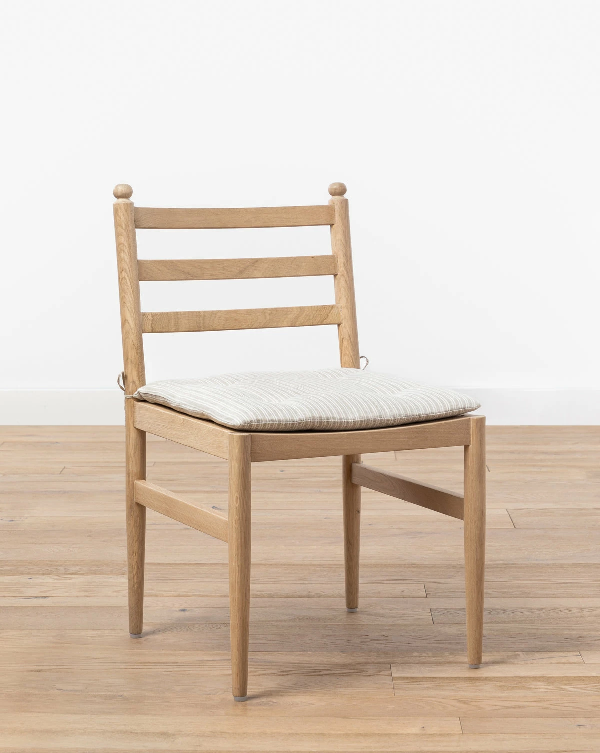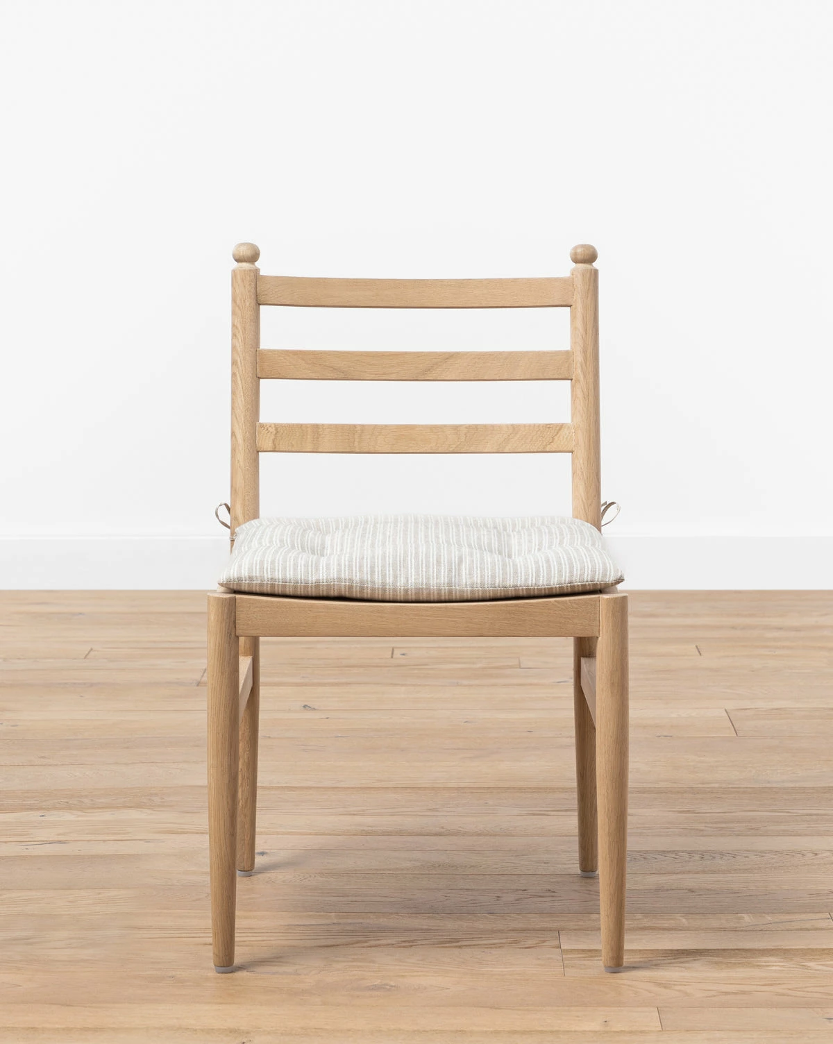 A modern update of a classic oak dining chair, the Romany Chair features unique details within its straightforward design. With a frame made from white oak and a tie-on cushion upholstered in 100% linen, this oak dining chair is a sophisticated yet approachable dining room staple.