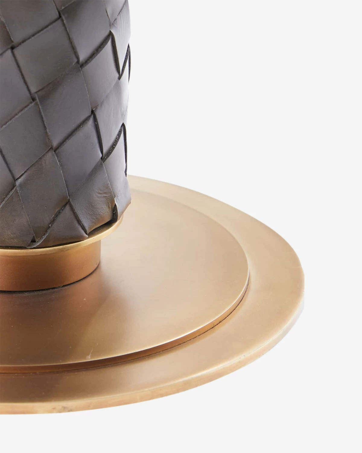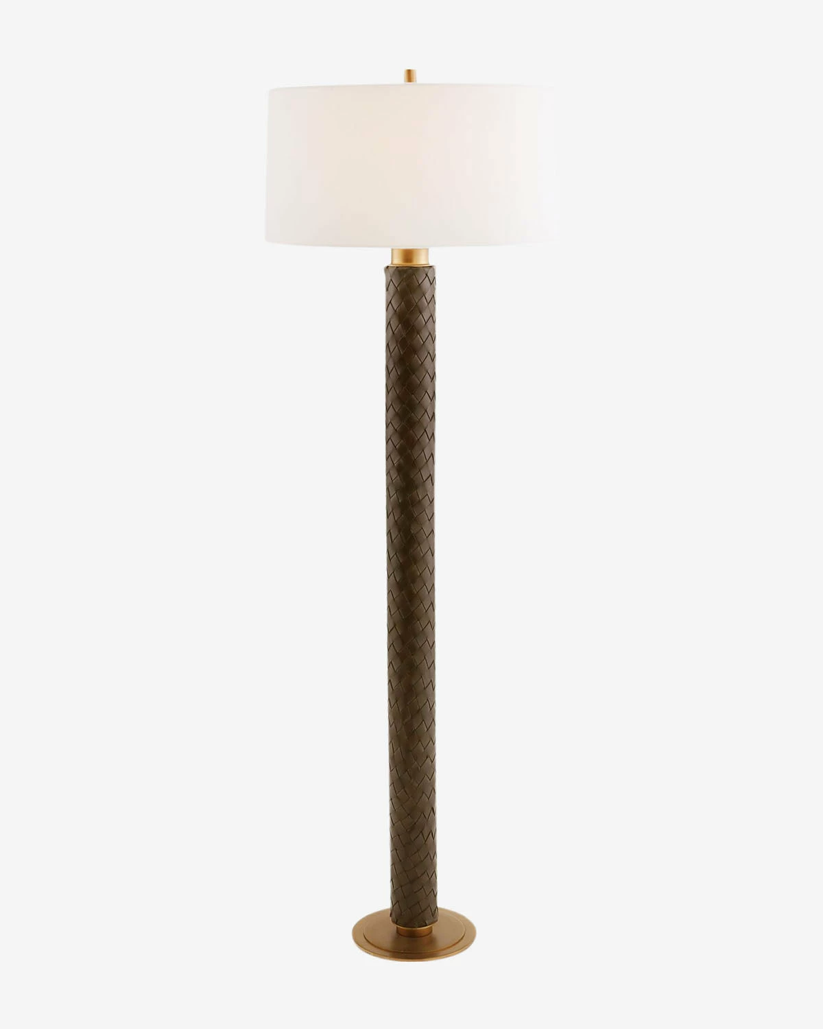With a straightforward design, the details of the Ropata Floor Lamp are what make it special. The column base is wrapped in chestnut leather braiding, for a subtle and sophisticated texture. Featuring a brass base and finial to complement the off-white linen drum shade, this floor lamp seamlessly elevates your home design.
