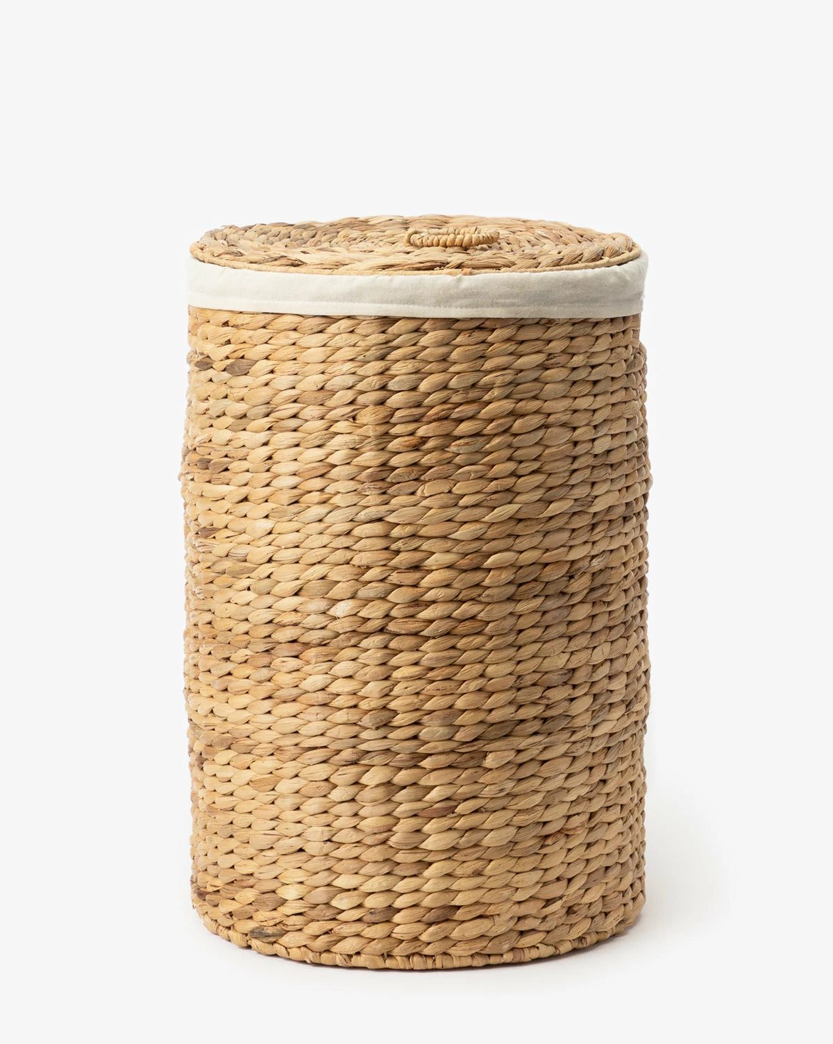 An unassuming take on the laundry basket, the Round Water Hyacinth Baskets are crafted with an iron frame and woven natural material for a high-quality piece that boasts an organic feel. Its removable lid, hole handles, and white fabric liner are functional features that elevate its use, while its rice nut weave and natural materials give a warm, thoughtful aesthetic to your space.
